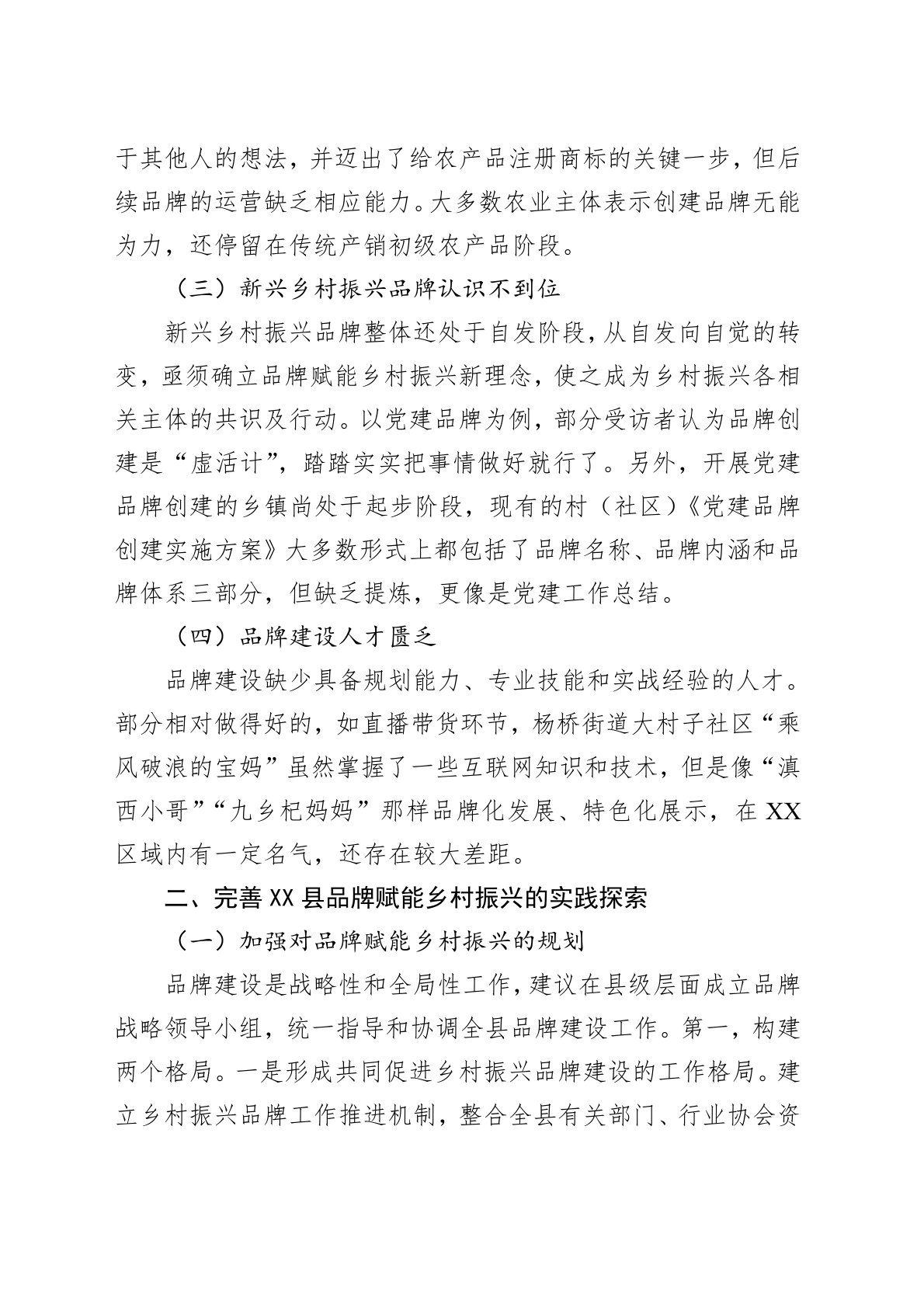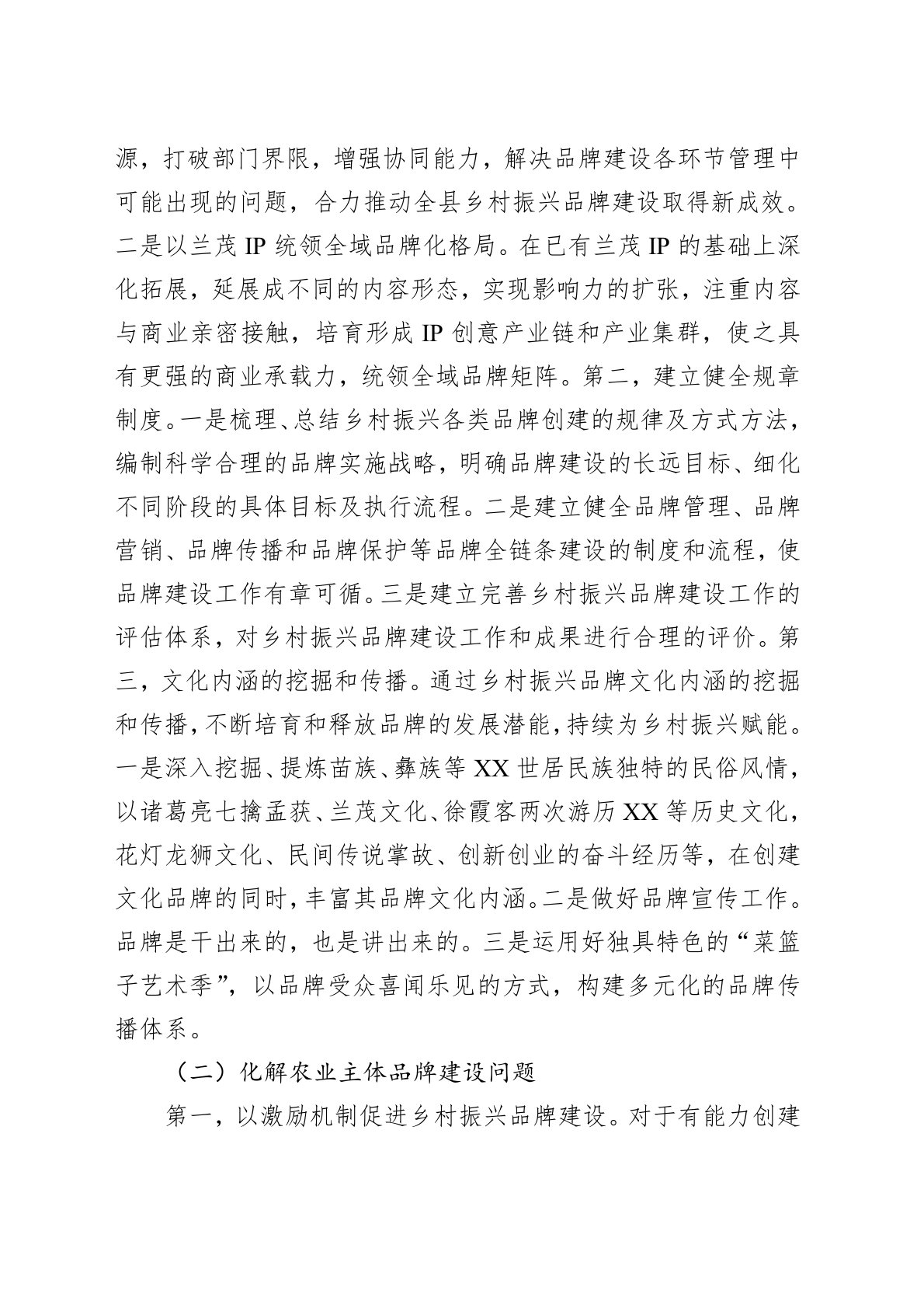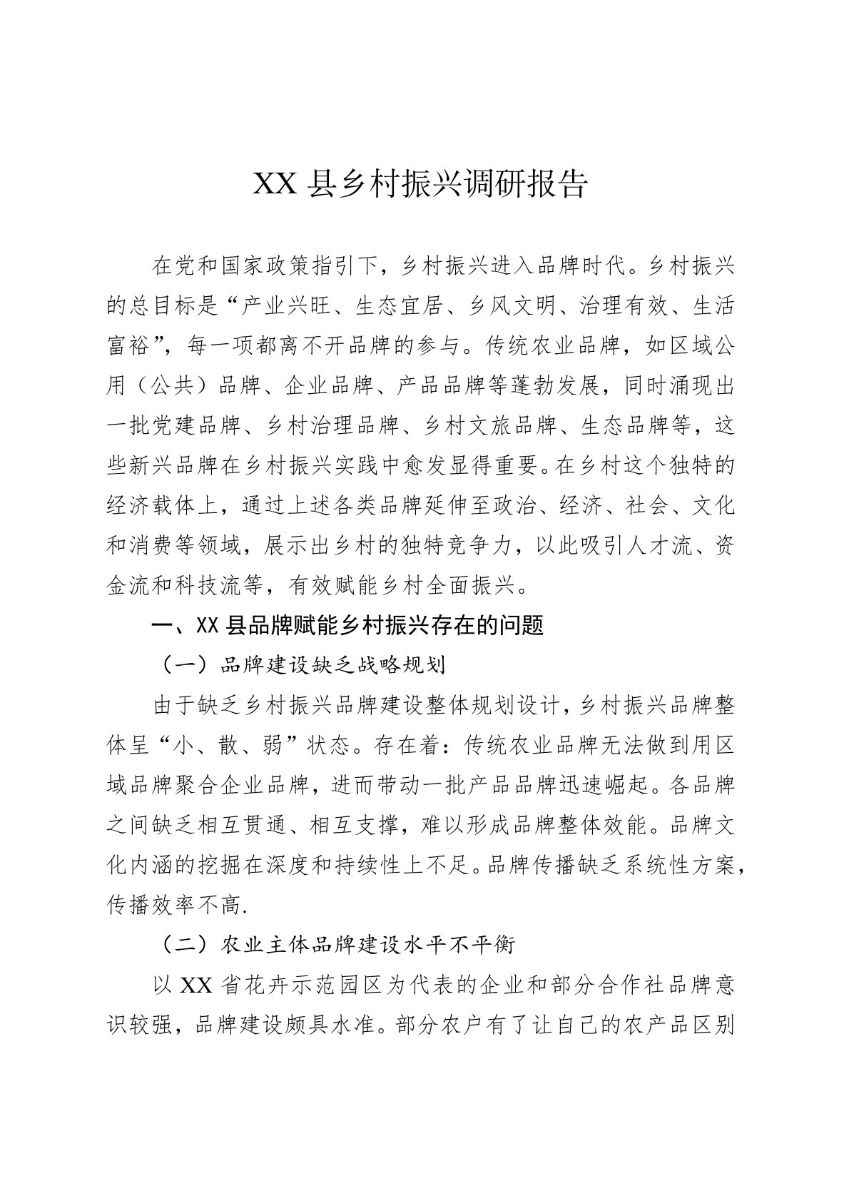 在党和国家政策指引下,乡村振兴进入品牌时代。乡村振兴的总目标是“产业兴旺、生态宜居、乡风文明、治理有效、生活富裕”,每一项都离不开品牌的参与。传统农业品牌,如区域公用(公共)品牌、企业品牌、产品品牌等蓬勃发展,同时涌现出一批党建品牌、乡村治理品牌、乡村文旅品牌、生态品牌等,这些新兴品牌在乡村振兴实践中愈发显得重要。在乡村这个独特的经济载体上,通过上述各类品牌延伸至政治、经济、社会、文化和消费等领域,展示出乡村的独特竞争力,以此吸引人才流、资金流和科技流等,有效赋能乡村全面振兴。一、XX县品牌赋能乡村振兴存在的问题(一)品牌建设缺乏战略规划由于缺乏乡村振兴品牌建设整体规划设计,乡村振兴品牌整体呈“小、散、弱”状态。存在着:传统农业品牌无法做到用区域品牌聚合企业品牌,进而带动一批产品品牌迅速崛起...