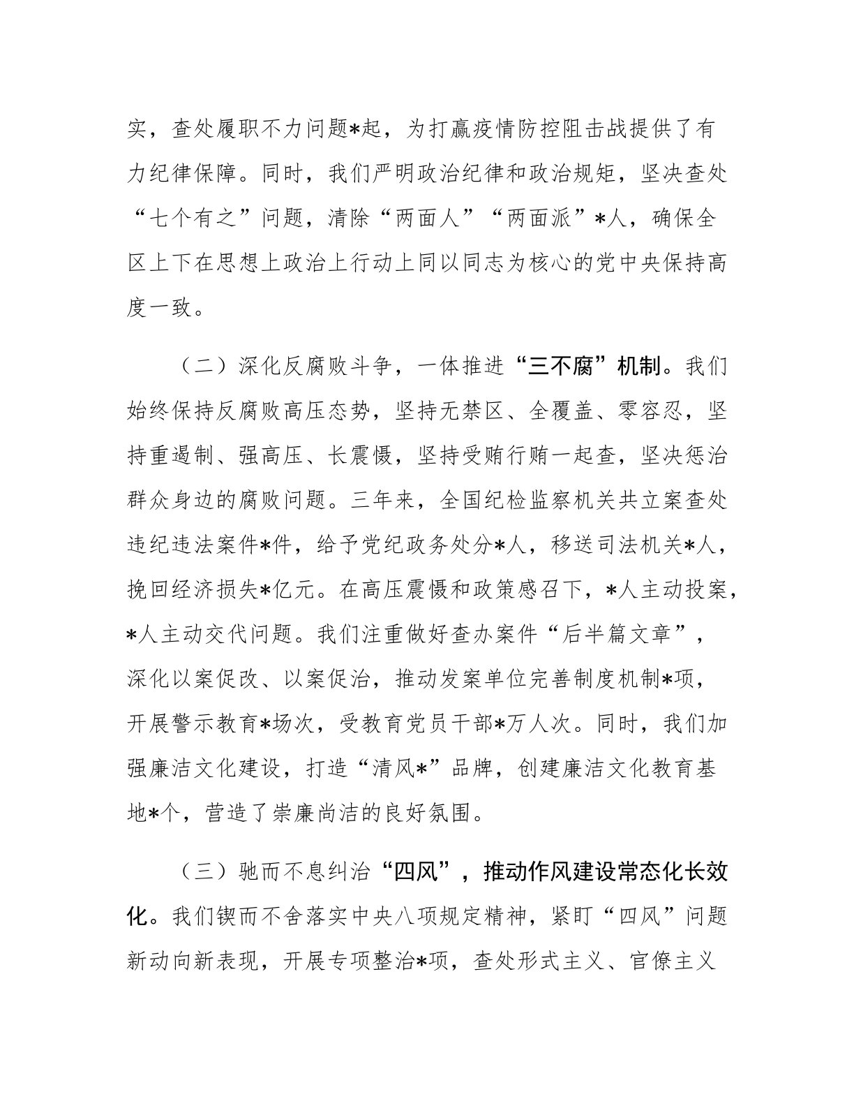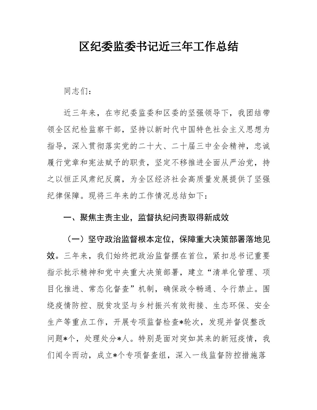 区纪委监委书记近三年工作总结同志们:近三年来,在市纪委监委和区委的坚强领导下,我团结带领全区纪检监察干部,坚持以新时代中国特色社会主义思想为指导,深入贯彻落实党的二十大、二十届三中全会精神,忠诚履行党章和宪法赋予的职责,坚定不移推进全面从严治党,持之以恒正风肃纪反腐,为全区经济社会高质量发展提供了坚强纪律保障。现将三年来的工作情况总结如下:一、聚焦主责主业,监督执纪问责取得新成效(一)坚守政治监督根本定位,保障重大决策部署落地见效。三年来,我们始终把政治监督摆在首位,紧扣总书记重要指示批示精神和党中央重大决策部署,建立“清单化管理、项目化推进、常态化督查”机制,确保政令畅通、令行禁止。围绕疫情防控、脱贫攻坚与乡村振兴有效衔接、生态环保、安全生产等重点工作,开展专项监督检查*轮次,发现并督促整...