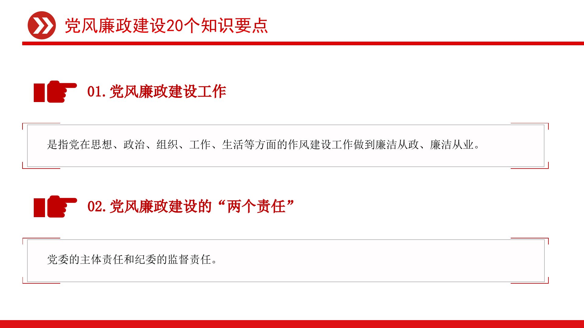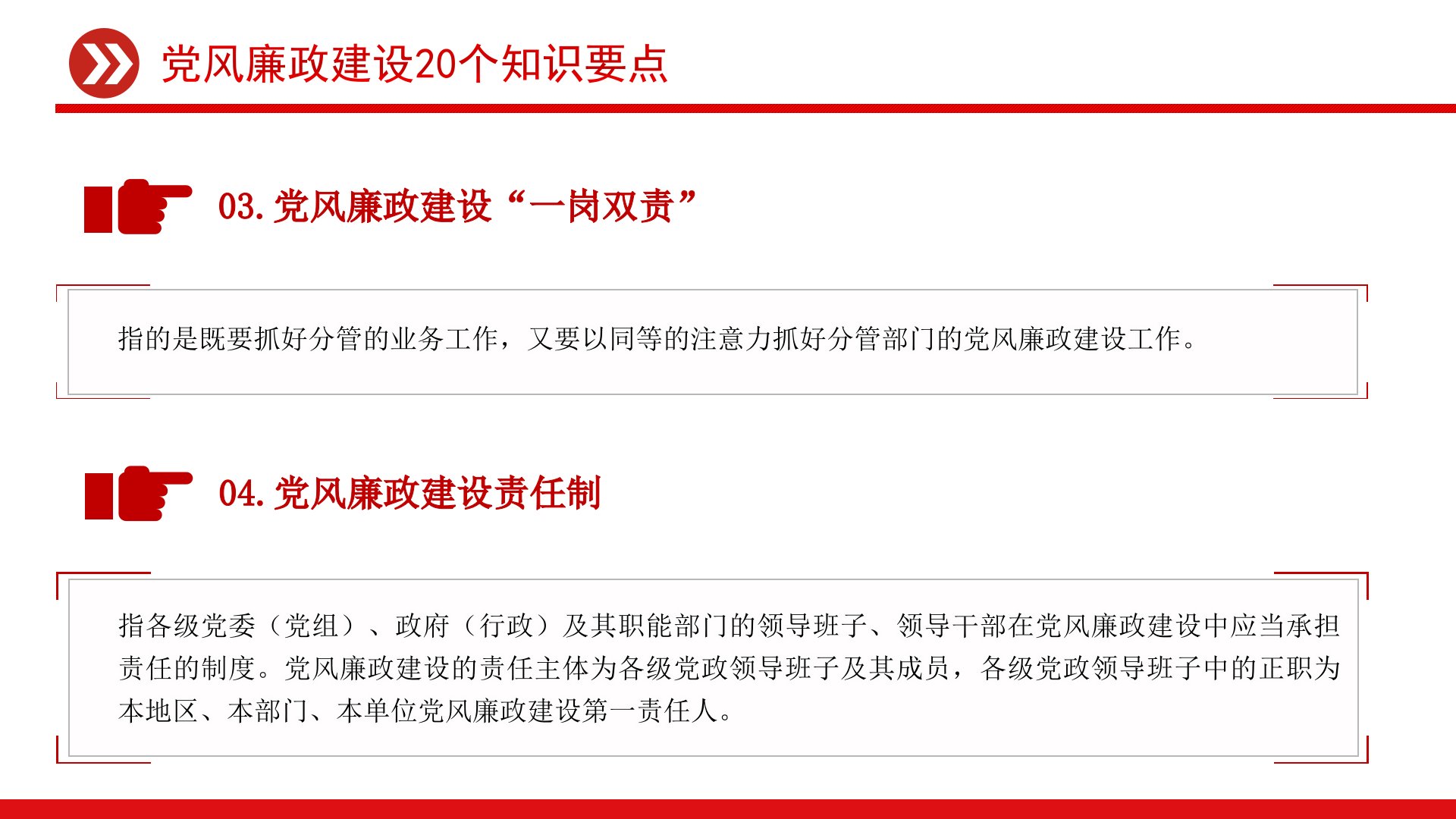 党风廉政建设20个知识要点党风廉政建设20个知识要点01.党风廉政建设工作是指党在思想、政治、组织、工作、生活等方面的作风建设工作做到廉洁从政、廉洁从业。02.党风廉政建设的“两个责任”党委的主体责任和纪委的监督责任。党风廉政建设20个知识要点03.党风廉政建设“一岗双责”指的是既要抓好分管的业务工作,又要以同等的注意力抓好分管部门的党风廉政建设工作。04.党风廉政建设责任制指各级党委(党组)、政府(行政)及其职能部门的领导班子、领导干部在党风廉政建设中应当承担责任的制度。党风廉政建设的责任主体为各级党政领导班子及其成员,各级党政领导班子中的正职为本地区、本部门、本单位党风廉政建设第一责任人。党风廉政建设20个知识要点05.党的规则党的规矩是党的各级组织和全体党员必须遵守的行为规范和准则,主...