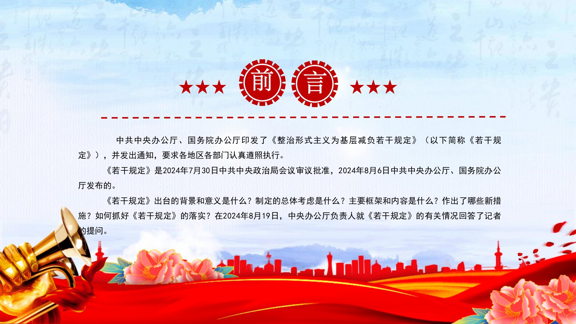 整治形式主义为基层减负若干规定中共中央办公厅、国务院办公厅印发了《整治形式主义为基层减负若干规定》(以下简称《若干规定》),并发出通知,要求各地区各部门认真遵照执行。《若干规定》是2024年7月30日中共中央政治局会议审议批准,2024年8月6日中共中央办公厅、国务院办公厅发布的。《若干规定》出台的背景和意义是什么?制定的总体考虑是什么?主要框架和内容是什么?作出了哪些新措施?如何抓好《若干规定》的落实?在2024年8月19日,中央办公厅负责人就《若干规定》的有关情况回答了记者的提问。第一章节《若干规定》出台的背景和意义制定出台《若干规定》,为深化拓展整治形式主义为基层减负工作提供重要制度遵循,是健全全面从严治党体系的重要举措。第二章节《若干规定》制定的总体考虑《若干规定》坚持以习近平新时代...
