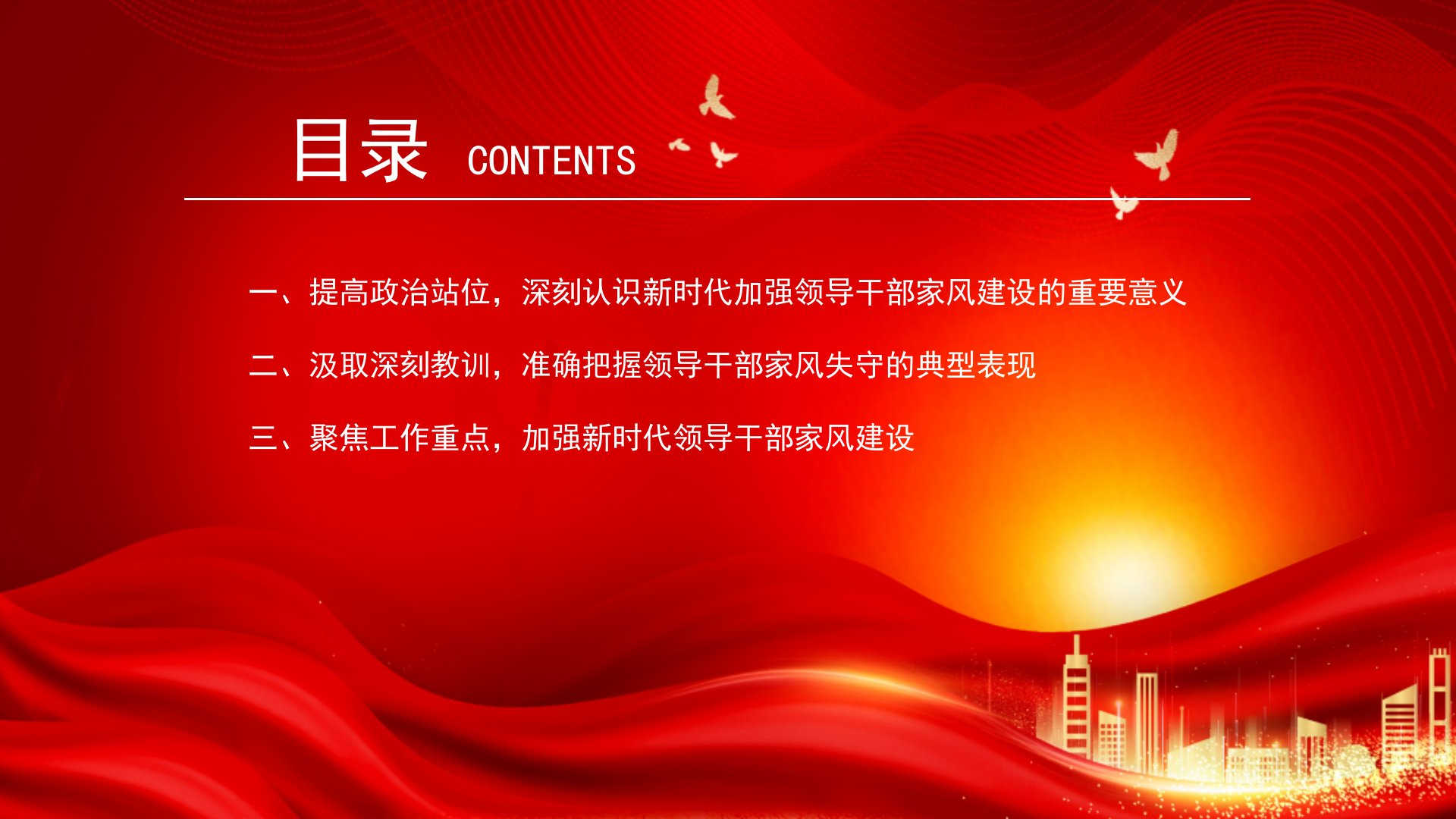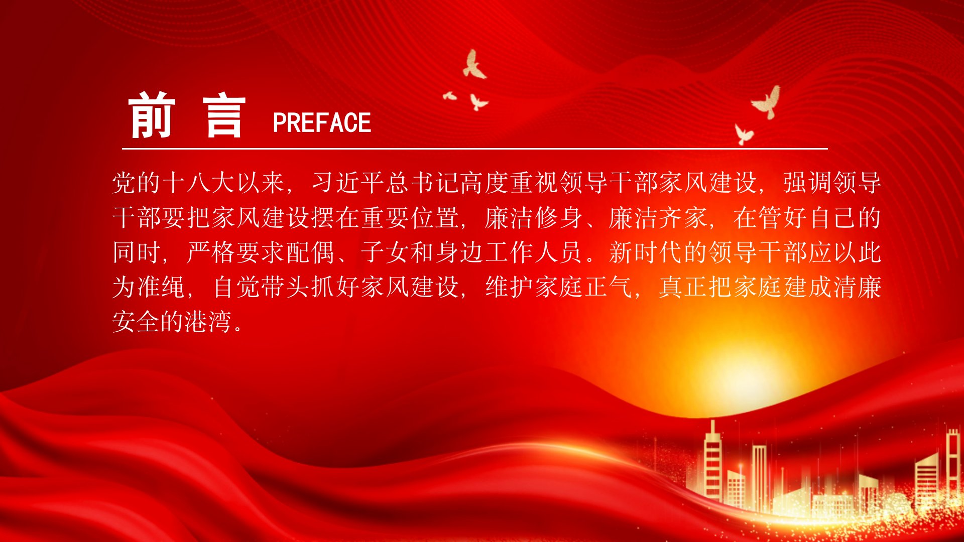 以家风建设助力党风廉政建设授课人:XXX前言PREFACE党的十八大以来,习近平总书记高度重视领导干部家风建设,强调领导干部要把家风建设摆在重要位置,廉洁修身、廉洁齐家,在管好自己的同时,严格要求配偶、子女和身边工作人员。新时代的领导干部应以此为准绳,自觉带头抓好家风建设,维护家庭正气,真正把家庭建成清廉安全的港湾。目录CONTENTS一、提高政治站位,深刻认识新时代加强领导干部家风建设的重要意义二、汲取深刻教训,准确把握领导干部家风失守的典型表现三、聚焦工作重点,加强新时代领导干部家风建设提高政治站位,深刻认识新时代加强领导干部家风建设的重要意义提高政治站位,深刻认识新时代加强领导干部家风建设的重要意义加强家风建设关乎党的根本宗旨的践行。习近平总书记强调,“江山就是人民,人民就是江山”,全...