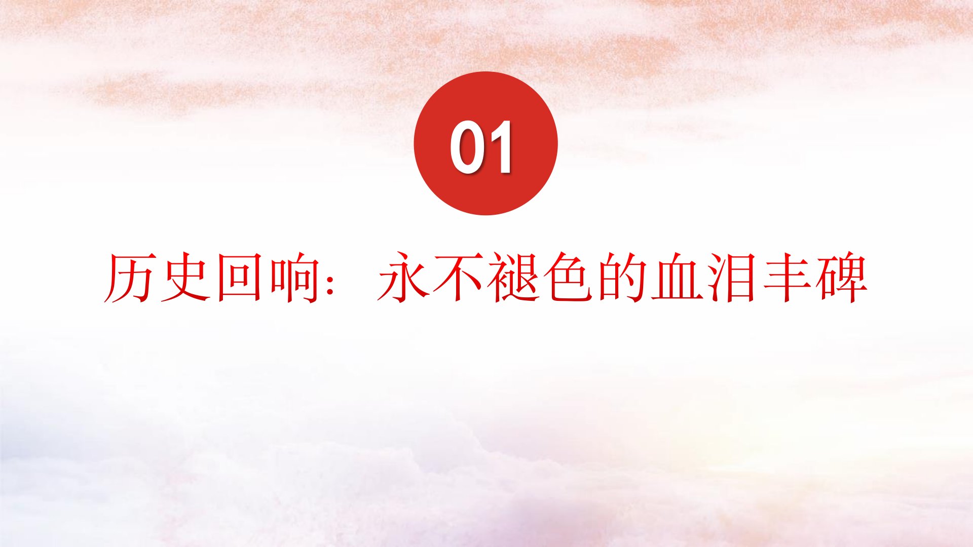 传承伟大抗战精神,开创和平发展未来——纪念反法西斯战争胜利80周年专题党课授课辅导——目录CONTENT历史回响:永不褪色的血泪丰碑历史回响:永不褪色的血泪丰碑1945年9月2日,东京湾密苏里号战舰上,日本签署无条件投降书,那一刻,中国以3500万军民伤亡、4200万难民无家可归的代价,换来了近代以来反侵略战争的首次完全胜利。从1931年“九一八”事变的第一声枪响,到1945年胜利的欢呼声,14年浴血奋战,中国战场牵制了日本陆军70%以上的兵力,粉碎了“三个月灭亡中国”的狂言。北京密云古北口长城上“大好河山,寸土不让”的刻痕,云南腾冲国殇墓园9168块墓碑上斑驳的姓名,都是这段历史最沉重的注脚。那些在战火中捐躯的先烈,用生命诠释了“天下兴亡、匹夫有责”的爱国情怀,他们的名字,永远镌刻在民族的...