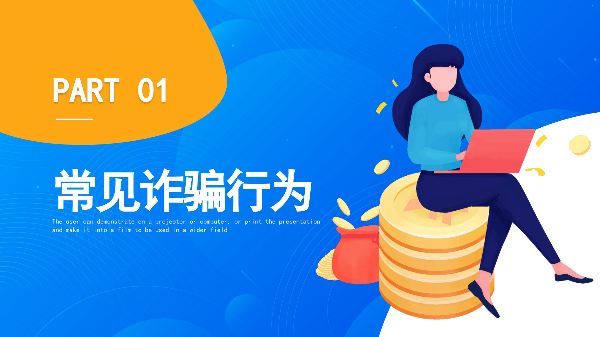 你我共防·全民反诈积极加强自我防范意识共同提高识骗防骗能力NETWORKSECURITYEDUCATION提升网络安全意识·养成良好用网习惯常见诈骗行为Theusercandemonstrateonaprojectororcomputer,orprintthepresentationandmakeitintoafilmtobeusedinawiderfield常见诈骗行为常见诈骗行为常见诈骗行为常见诈骗行为常见诈骗行为常见诈骗行为常见诈骗行为常见诈骗行为以你在网上订购的商品因为系统故障等原因需要进行退货操作,并在电话中要你在网上进行操作,有些骗子更加直接,要你将电脑交给对方远程控制,不论何种方式,一旦你手机收到了支付宝的验证码,你一定要妥善保管,不要按照对方的要求将验证码输入电脑或是告诉对方...