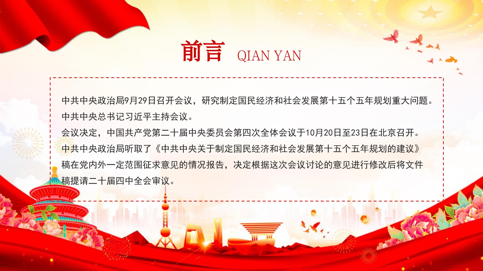 二十届四中全会二十届四中全会10月20日至23日召开中共中央政治局9月29日召开会议,研究制定国民经济和社会发展第十五个五年规划重大问题。中共中央总书记习近平主持会议。会议决定,中国共产党第二十届中央委员会第四次全体会议于10月20日至23日在北京召开。中共中央政治局听取了《中共中央关于制定国民经济和社会发展第十五个五年规划的建议》稿在党内外一定范围征求意见的情况报告,决定根据这次会议讨论的意见进行修改后将文件稿提请二十届四中全会审议。二十届四中全会这次征求意见充分发扬民主、集思广益,各地区各部门各方面对建议稿给予充分肯定,认为建议稿准确把握“十五五”时期党和国家事业发展所处历史方位,深入分析我国发展环境面临的深刻复杂变化,对未来五年发展作出顶层设计和战略擘画,是乘势而上、接续推进中国式现代...