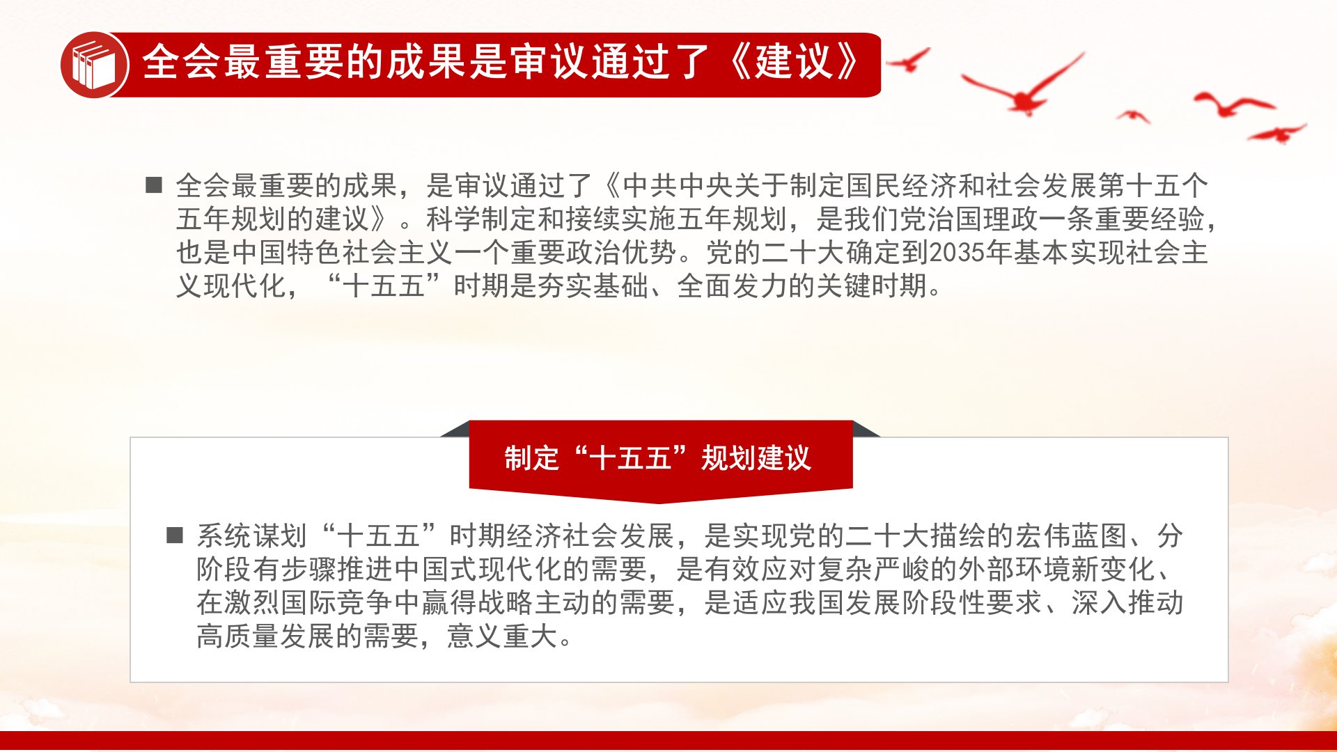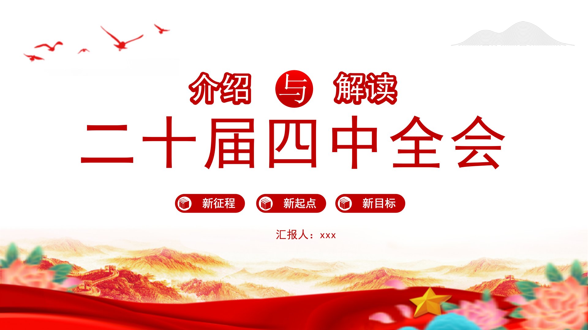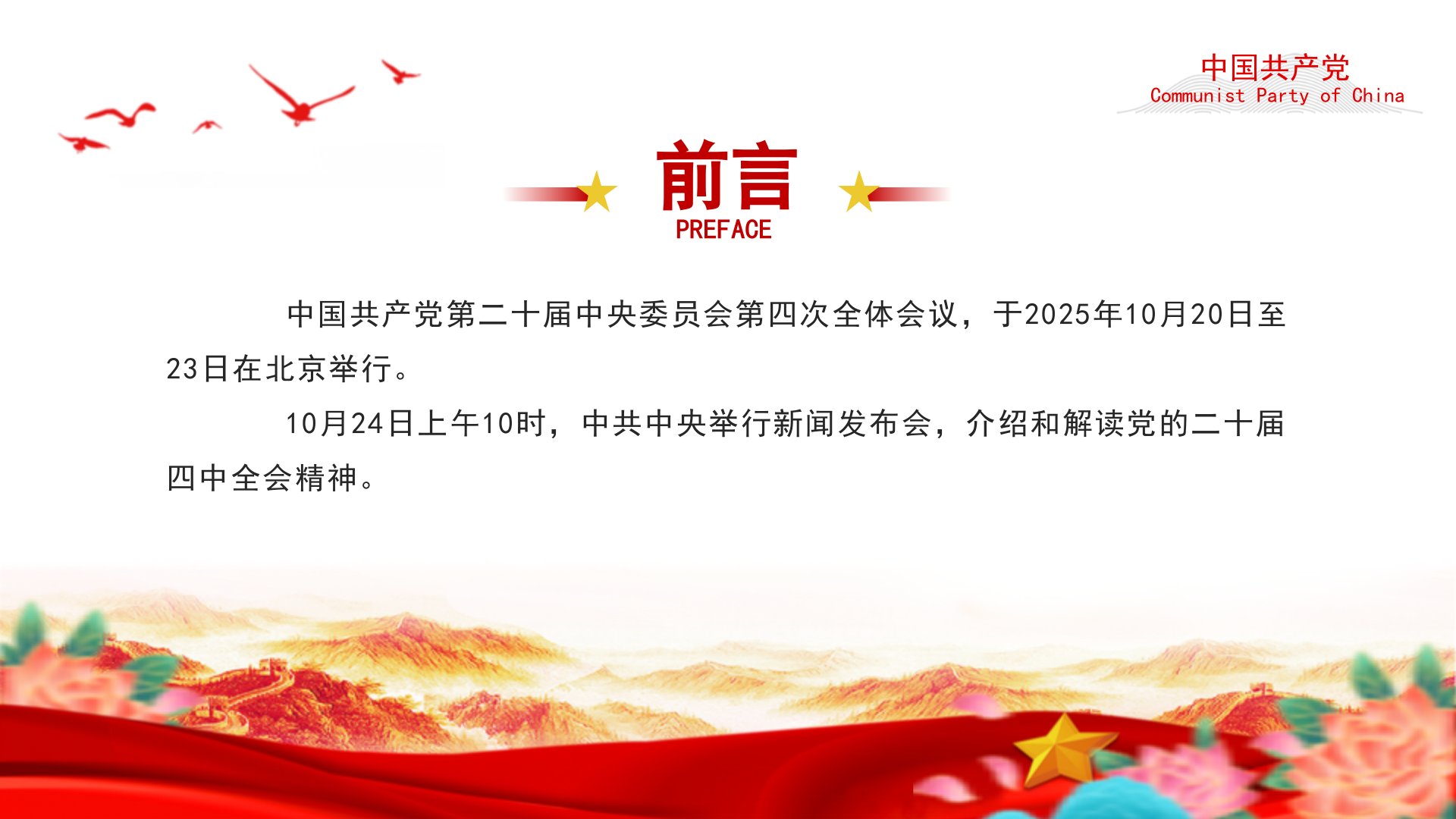 汇报人:xxx二十届四中全会中国共产党第二十届中央委员会第四次全体会议,于2025年10月20日至23日在北京举行。10月24日上午10时,中共中央举行新闻发布会,介绍和解读党的二十届四中全会精神。系统谋划“十五五”时期经济社会发展,是实现党的二十大描绘的宏伟蓝图、分阶段有步骤推进中国式现代化的需要,是有效应对复杂严峻的外部环境新变化、在激烈国际竞争中赢得战略主动的需要,是适应我国发展阶段性要求、深入推动高质量发展的需要,意义重大。制定“十五五”规划建议全会最重要的成果,是审议通过了《中共中央关于制定国民经济和社会发展第十五个五年规划的建议》。科学制定和接续实施五年规划,是我们党治国理政一条重要经验,也是中国特色社会主义一个重要政治优势。党的二十大确定到2035年基本实现社会主义现代化,“十...