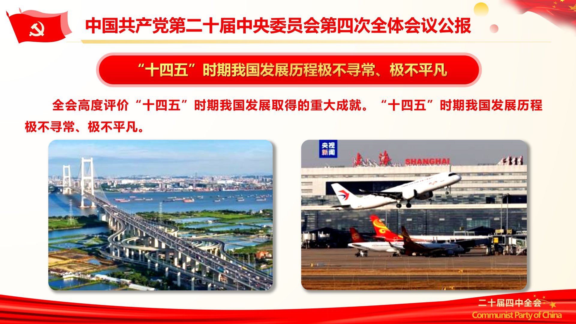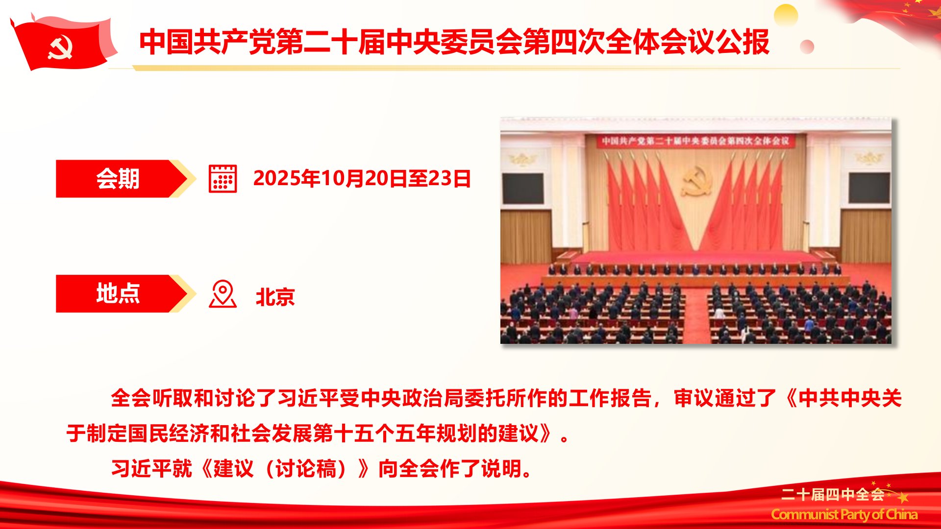 党的二十届四中全会公报重点内容学习全会听取和讨论了习近平受中央政治局委托所作的工作报告,审议通过了《中共中央关于制定国民经济和社会发展第十五个五年规划的建议》。习近平就《建议(讨论稿)》向全会作了说明。“十四五”时期我国发展历程极不寻常、极不平凡全会高度评价“十四五”时期我国发展取得的重大成就。“十四五”时期我国发展历程极不寻常、极不平凡。“十四五”时期我国发展历程极不寻常、极不平凡面对错综复杂的国际形势和艰巨繁重的国内改革发展稳定任务,以习近平同志为核心的党中央团结带领全党全国各族人民,迎难而上、砥砺前行,经受住世纪疫情严重冲击,有效应对一系列重大风险挑战,推动党和国家事业取得新的重大成就。我国经济实力、科技实力、综合国力跃上新台阶,中国式现代化迈出新的坚实步伐,第二个百年奋斗目标新征程实...