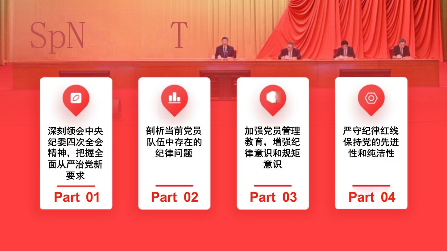 贯彻中央纪委四次全会精神强化党员管理教育严守纪律红线学习贯彻中央纪委四次全会精神YOURLOGO在新时代全面从严治党的伟大征程中,中央纪委四次全会犹如一盏明灯,照亮我们前行的道路,为加强党的建设、推进党风廉政建设和反腐败斗争指明了方向,提出了新要求、新部署。党的纪律是党的生命线,是保持党的先进性和纯洁性的重要保障。党员作为党的肌体的细胞,其纪律意识和规矩意识直接关系到党的凝聚力、战斗力。今天,我们围绕“贯彻中央纪委四次全会精神,强化党员管理教育,严守纪律红线”这一主题,深入探讨如何在新时代背景下,通过加强党员管理教育,严守纪律红线,推动全面从严治党向纵深发展。1加强党员管理教育,增强纪律意识和规矩意识Part03SpNT剖析当前党员队伍中存在的纪律问题Part02严守纪律红线保持党的先进性和...