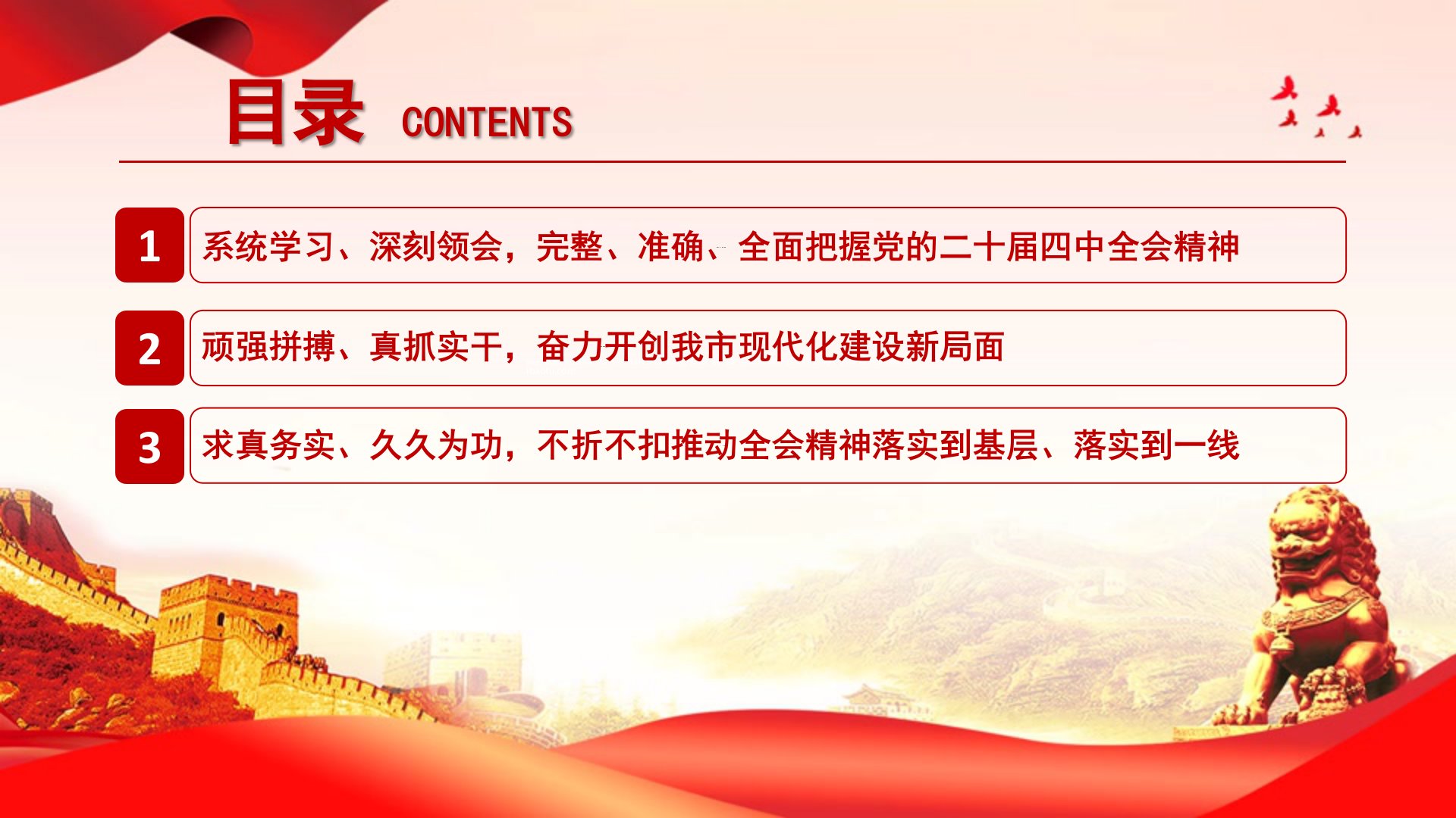 深入学习贯彻党的二十届四中全会精神,奋力推进中国式现代化我市实践新篇前言党的二十届四中全会,是在“十四五”即将收官、“十五五”即将开启的关键节点召开的一次具有全局性、历史性意义的重要会议。全会审议通过的《中共中央关于制定国民经济和社会发展第十五个五年规划和二〇三五年远景目标的建议》,高瞻远瞩、思想深刻、内涵丰富,深刻总结了“十四五”时期我国发展取得的非凡成就,科学谋划了“十五五”时期我国经济社会发展的宏伟蓝图,是指导未来五年乃至更长时期我国经济社会发展的纲领性文件。学习好、宣传好、贯彻好全会精神,是当前和今后一个时期全市上下的首要政治任务。目录CONTENTS123系统学习、深刻领会,完整、准确、全面把握党的二十届四中全会精神顽强拼搏、真抓实干,奋力开创我市现代化建设新局面锚定高质量发展首要...