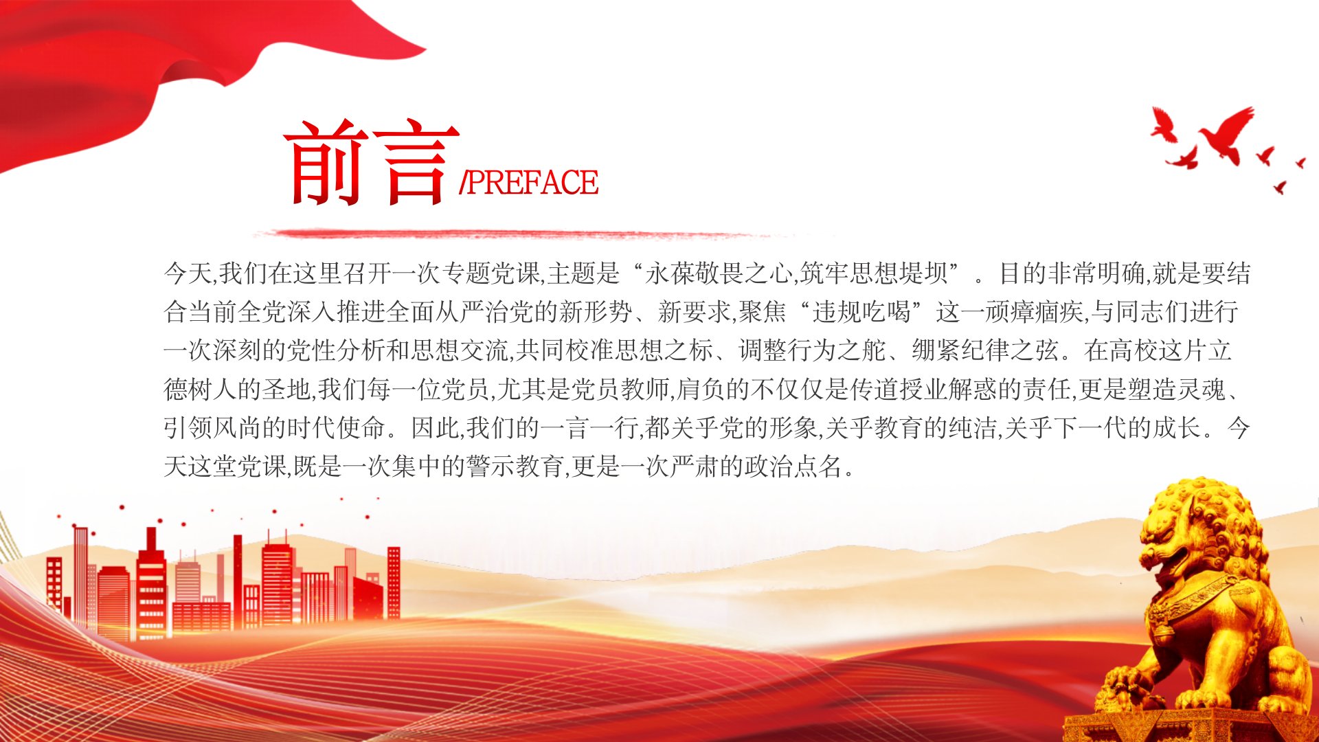 永葆敬畏之心筑牢思想堤坝今天,我们在这里召开一次专题党课,主题是“永葆敬畏之心,筑牢思想堤坝”。目的非常明确,就是要结合当前全党深入推进全面从严治党的新形势、新要求,聚焦“违规吃喝”这一顽瘴痼疾,与同志们进行一次深刻的党性分析和思想交流,共同校准思想之标、调整行为之舵、绷紧纪律之弦。在高校这片立德树人的圣地,我们每一位党员,尤其是党员教师,肩负的不仅仅是传道授业解惑的责任,更是塑造灵魂、引领风尚的时代使命。因此,我们的一言一行,都关乎党的形象,关乎教育的纯洁,关乎下一代的成长。今天这堂党课,既是一次集中的警示教育,更是一次严肃的政治点名。前言/PREFACE深刻洞察,准确把握违规吃喝问题的极端危害性与复杂顽固性作风问题无小事,吃喝问题是作风问题的“晴雨表”。我们必须清醒地认识到,违规吃喝绝不...