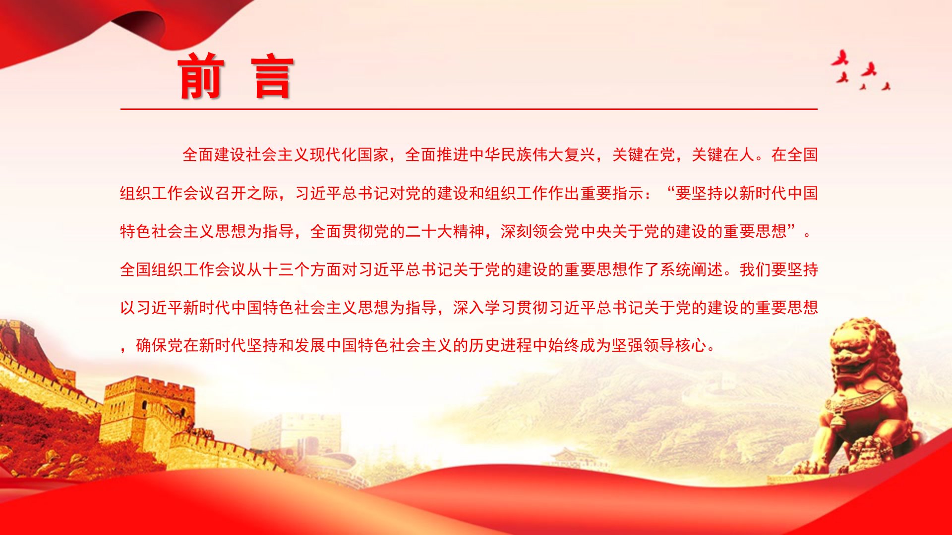 深入学习贯彻习近平总书记关于党的建设的重要思想前言全面建设社会主义现代化国家,全面推进中华民族伟大复兴,关键在党,关键在人。在全国组织工作会议召开之际,习近平总书记对党的建设和组织工作作出重要指示:“要坚持以新时代中国特色社会主义思想为指导,全面贯彻党的二十大精神,深刻领会党中央关于党的建设的重要思想”。全国组织工作会议从十三个方面对习近平总书记关于党的建设的重要思想作了系统阐述。我们要坚持以习近平新时代中国特色社会主义思想为指导,深入学习贯彻习近平总书记关于党的建设的重要思想,确保党在新时代坚持和发展中国特色社会主义的历史进程中始终成为坚强领导核心。目录CONTENTS123充分认识习近平总书记关于党的建设的重要思想的重大意义伟大的时代孕育伟大的思想,伟大的思想引领伟大的时代。为丰富和发展...