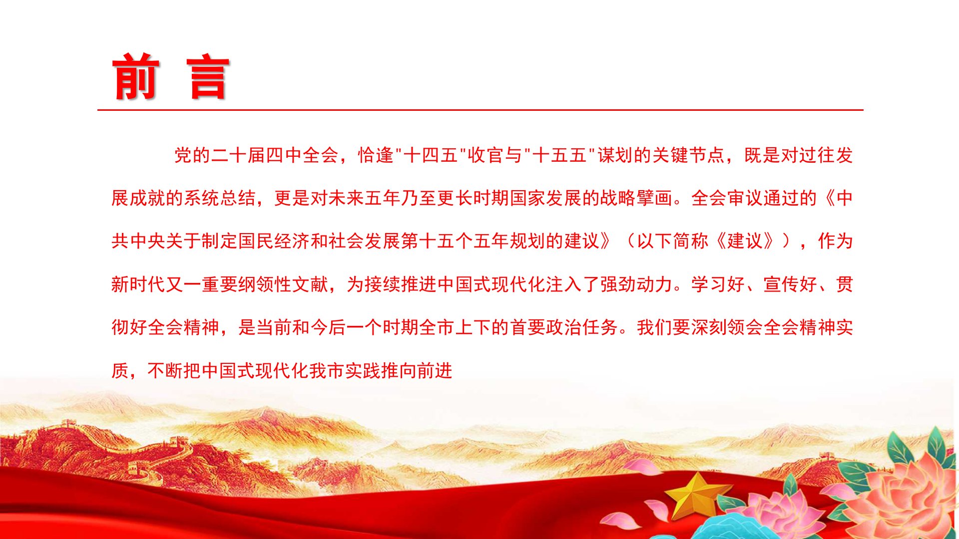 汇报人:XXX深刻学习领会二十届四中全会精神,不断把中国式现代化我市实践推向前进前言党的二十届四中全会,恰逢"十四五"收官与"十五五"谋划的关键节点,既是对过往发展成就的系统总结,更是对未来五年乃至更长时期国家发展的战略擘画。全会审议通过的《中共中央关于制定国民经济和社会发展第十五个五年规划的建议》(以下简称《建议》),作为新时代又一重要纲领性文献,为接续推进中国式现代化注入了强劲动力。学习好、宣传好、贯彻好全会精神,是当前和今后一个时期全市上下的首要政治任务。我们要深刻领会全会精神实质,不断把中国式现代化我市实践推向前进目录CONTENTS一、深刻领会党的二十届四中全会精神实质二、以全会精神指引推进中国式现代化我市实践三、切实推动全会精神落实到基层、落实到一线深刻领会党的二十届四中全会精神...