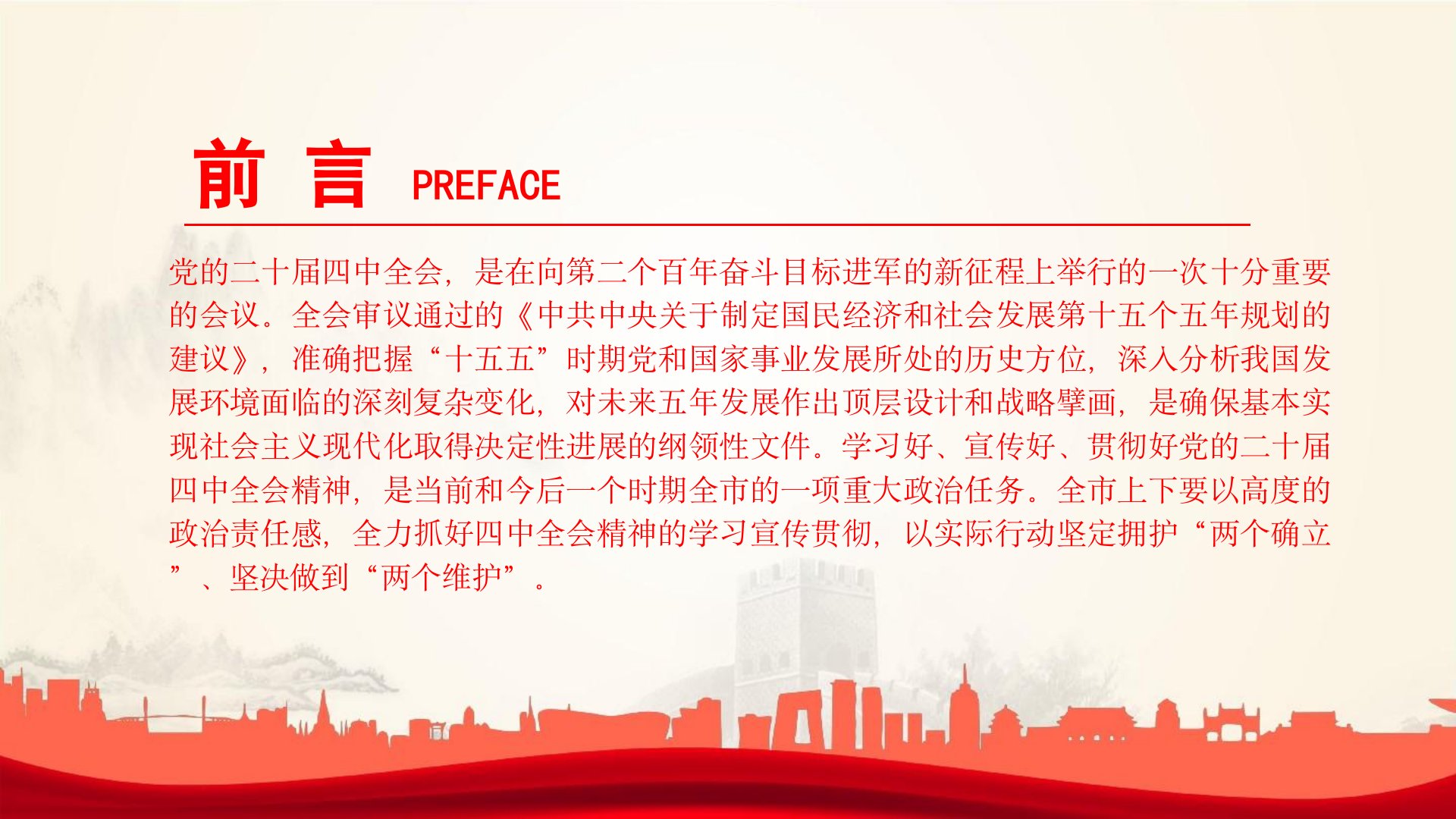 深入学习贯彻党的二十届四中全会精神,不断把中国式现代化我市实践推向前进授课人:XXX前言PREFACE党的二十届四中全会,是在向第二个百年奋斗目标进军的新征程上举行的一次十分重要的会议。全会审议通过的《中共中央关于制定国民经济和社会发展第十五个五年规划的建议》,准确把握“十五五”时期党和国家事业发展所处的历史方位,深入分析我国发展环境面临的深刻复杂变化,对未来五年发展作出顶层设计和战略擘画,是确保基本实现社会主义现代化取得决定性进展的纲领性文件。学习好、宣传好、贯彻好党的二十届四中全会精神,是当前和今后一个时期全市的一项重大政治任务。全市上下要以高度的政治责任感,全力抓好四中全会精神的学习宣传贯彻,以实际行动坚定拥护“两个确立”、坚决做到“两个维护”。目录CONTENTS一、深刻领会、准确把...