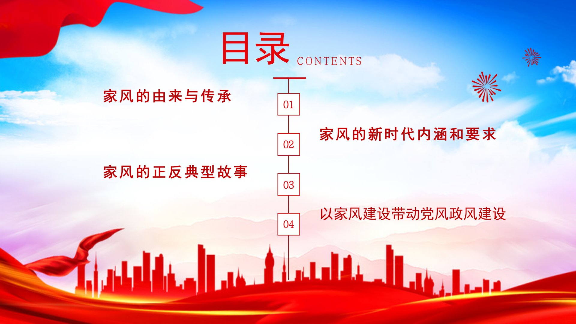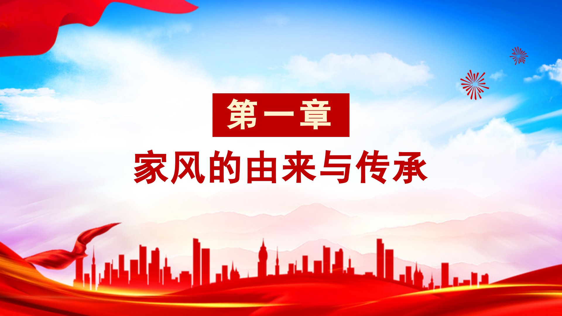 以家风建设带动党风政风建设家风的由来与传承家风的正反典型故事家风的新时代内涵和要求以家风建设带动党风政风建设家风的由来与传承第一章“绾发绾发,发亦鬒止;曰祗曰祗,敬亦慎止;靡专靡有,受之父母。鸣鹤匪和,析薪弗荷;隐忧孔疚,我堂靡构。义方既训,家道颖颖;岂敢荒宁,一日三省。”家风的由来家风不可忽视,家训不可小觑人品十分重要,习惯决定人生家风是一种集体认同,是经过家庭长期培养、长辈们反复实践、言传身教、世世代代传承下来的道德品质和生活作风。清代林则徐也告诫儿子“子孙若如我,留钱干什么?贤而多财,则损其智。子孙不如我,留钱做什么?愚而多财,益增其过”。以《颜氏家训》、《曾国藩家训》为代表的一整套孝亲、和邻、尊师、修身乃至为政的道德观念和行为准则,既是个人成长、家庭生存的精神足迹,也是传统文化的集体...