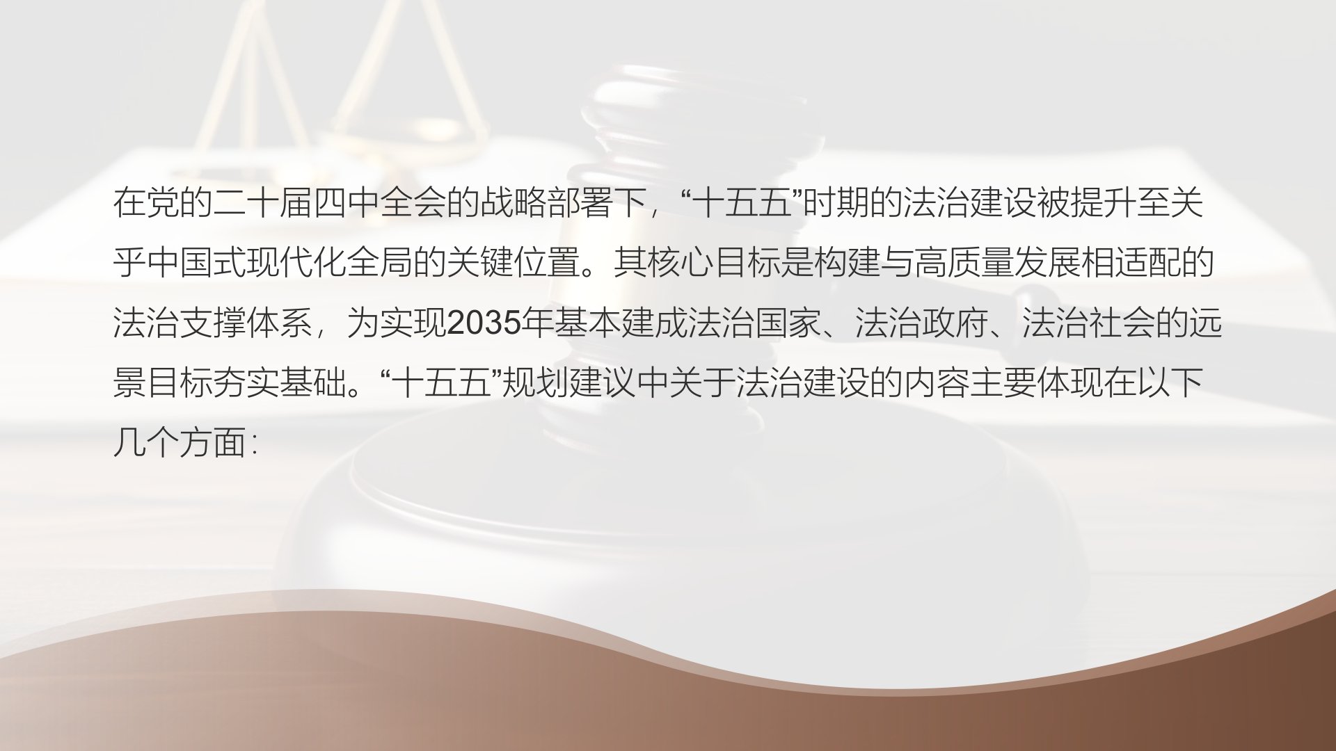 “十五五”规划建议的依法治国在党的二十届四中全会的战略部署下,“十五五”时期的法治建设被提升至关乎中国式现代化全局的关键位置。其核心目标是构建与高质量发展相适配的法治支撑体系,为实现2035年基本建成法治国家、法治政府、法治社会的远景目标夯实基础。“十五五”规划建议中关于法治建设的内容主要体现在以下几个方面:01总体战略定位 法治是推动中国式现代化的制度根基,为经济社会发展提供坚强法治保障。构建“重点突出、新兴覆盖、涉外衔接”的立法格局,加强重点领域、新兴领域、涉外领域立法。01科学立法:填补空白与回应时代02严格执法:统筹好“有为政府”与“有效市场”强调立法质量与体系化,加强立法规划和审查,提高立法精准化、精细化水平,尤其针对数字经济、人工智能等新兴领域进行前瞻性布局。同时,强化宪法监督,...