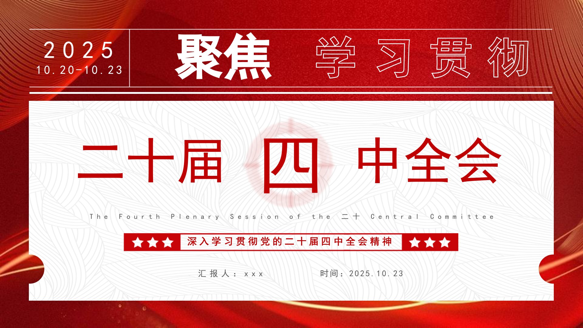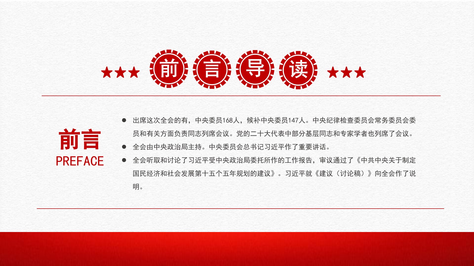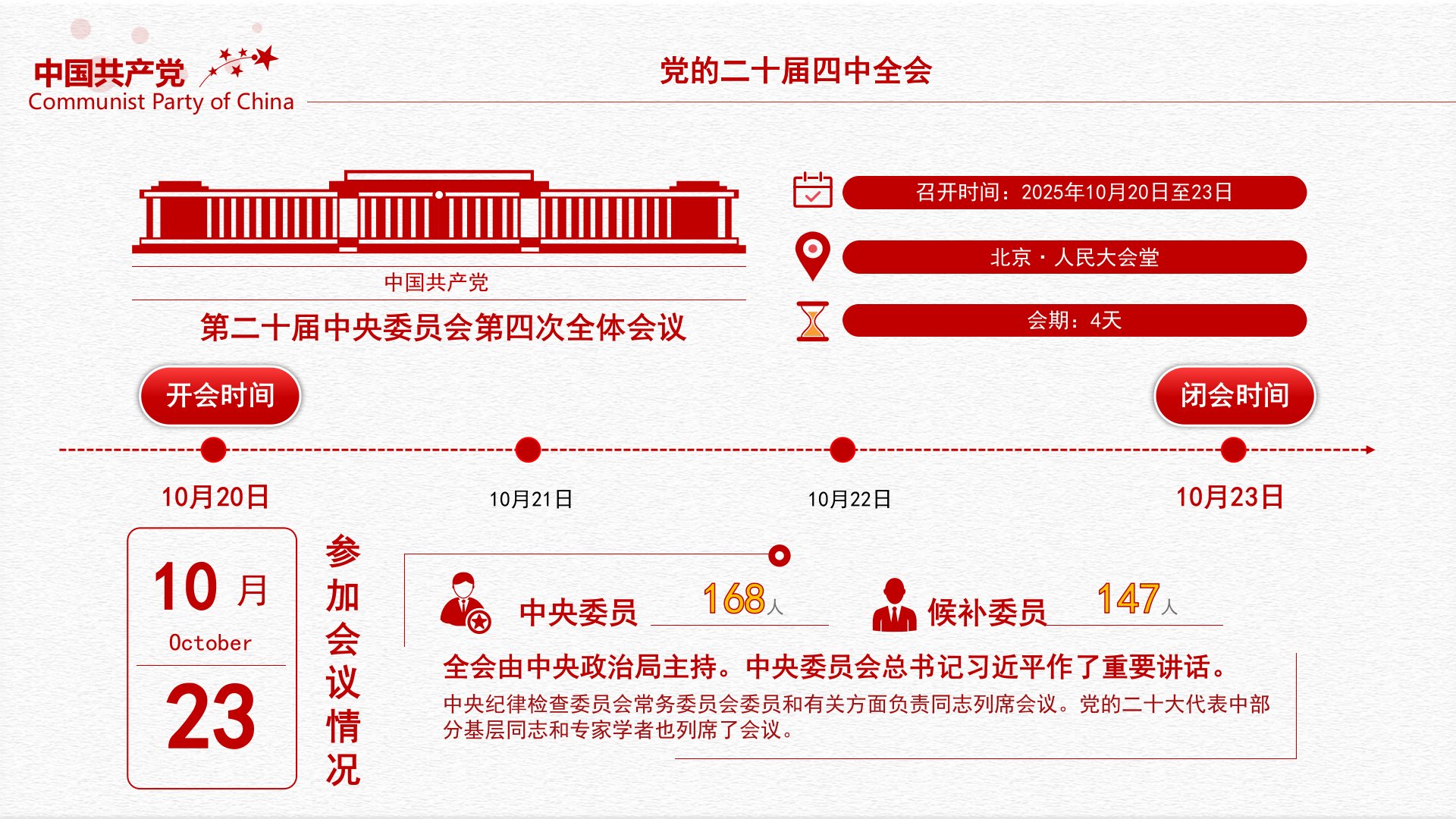 202510.20-10.23学习贯彻聚焦二十届中全会TheFourthPlenarySessionofthe二十CentralCommittee四前言PREFACE出席这次全会的有,中央委员168人,候补中央委员147人。中央纪律检查委员会常务委员会委员和有关方面负责同志列席会议。党的二十大代表中部分基层同志和专家学者也列席了会议。全会由中央政治局主持。中央委员会总书记习近平作了重要讲话。全会听取和讨论了习近平受中央政治局委托所作的工作报告,审议通过了《中共中央关于制定国民经济和社会发展第十五个五年规划的建议》。习近平就《建议(讨论稿)》向全会作了说明。党的二十届四中全会候补委员中国共产党第二十届中央委员会第四次全体会议召开时间:2025年10月20日至23日北京·人民大会堂会期:4天参加...