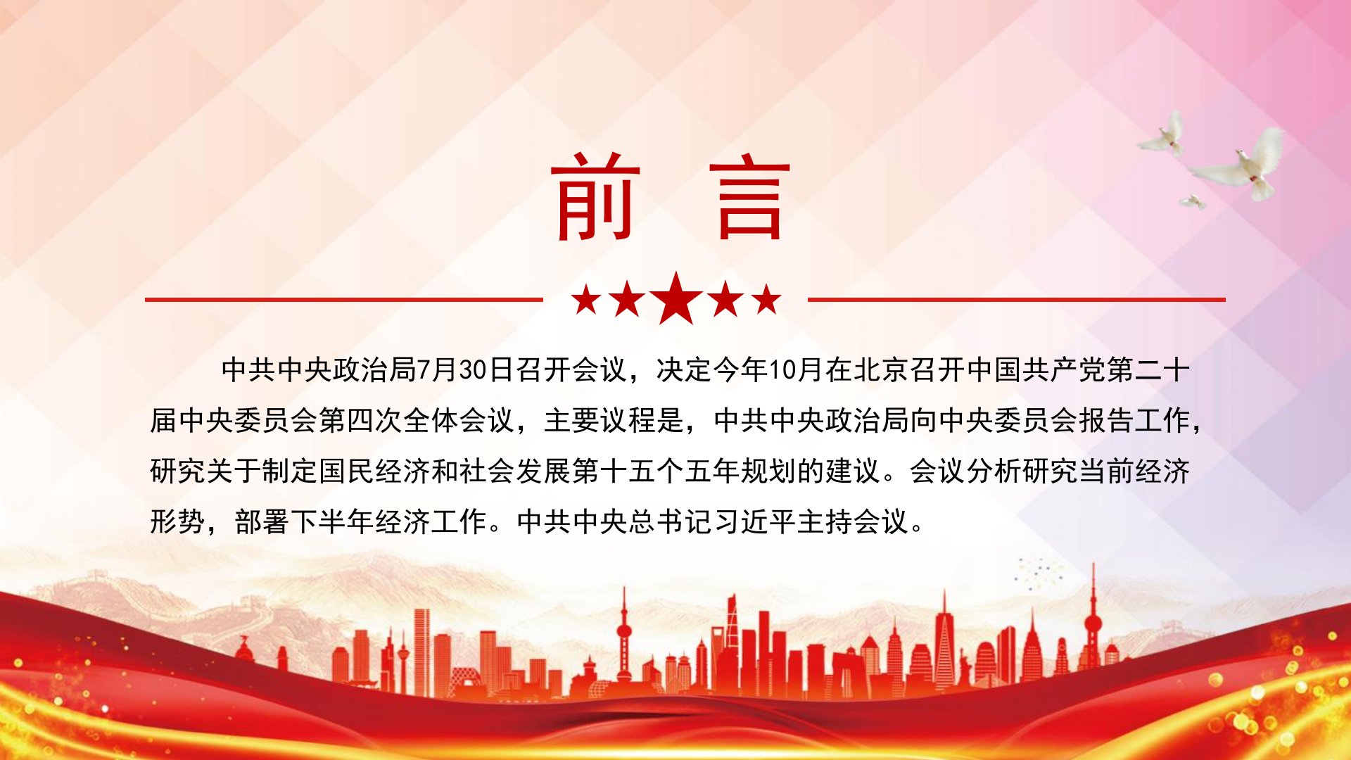 二十届四中全会议程——中共中央政治局向中央委员会报告工作,研究关于制定国民经济和社会发展第十五个五年规划的建议——中共中央政治局7月30日召开会议,决定今年10月在北京召开中国共产党第二十届中央委员会第四次全体会议,主要议程是,中共中央政治局向中央委员会报告工作,研究关于制定国民经济和社会发展第十五个五年规划的建议。会议分析研究当前经济形势,部署下半年经济工作。中共中央总书记习近平主持会议。前言“十五五”时期是基本实现社会主义现代化夯实基础、全面发力的关键时期,我国发展环境面临深刻复杂变化,战略机遇和风险挑战并存、不确定难预料因素增多,同时我国经济基础稳、优势多、韧性强、潜能大,长期向好的支撑条件和基本趋势没有变,中国特色社会主义制度优势、超大规模市场优势、完整产业体系优势、丰富人才资源优势...