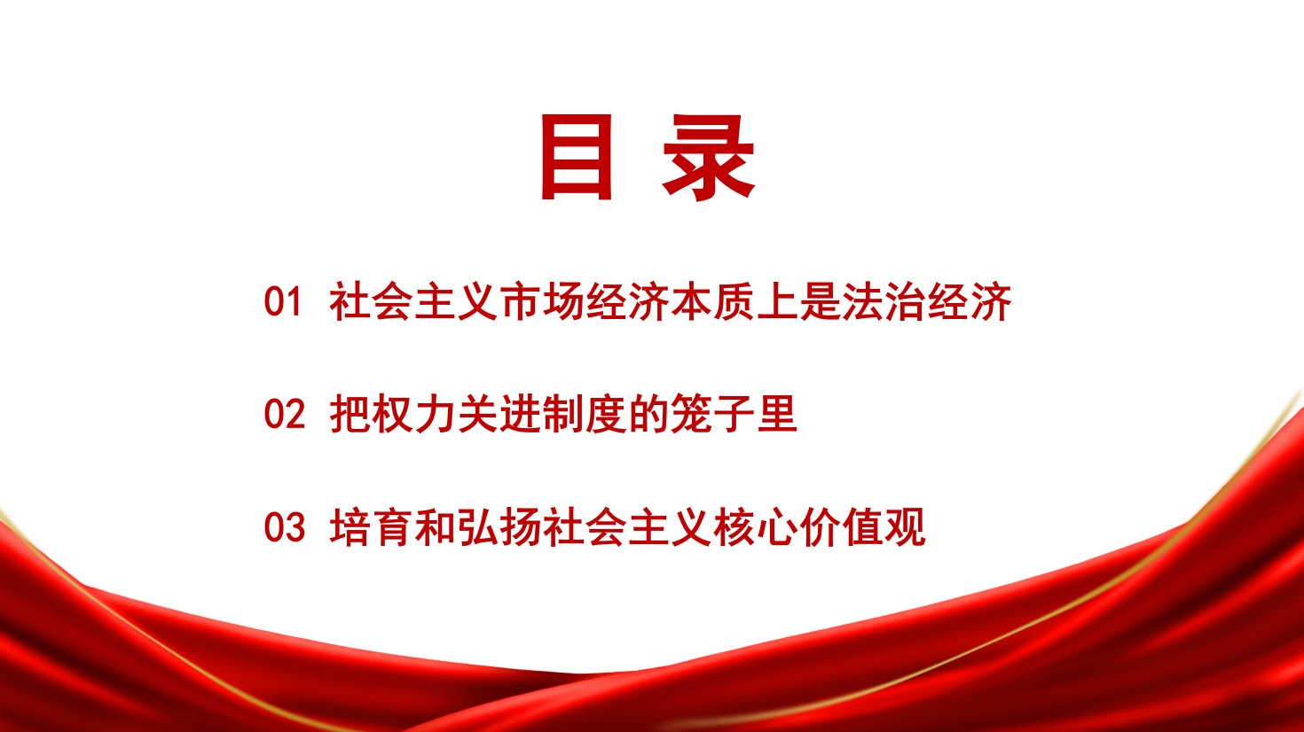 新时代反腐倡廉的制度设计与价值观培育前言党的十八大以来,以习近平同志为核心的党中央以高压态势持续推进反腐败斗争,赢得人民群众的衷心拥护和支持。反腐败治标治本涤荡官场旧习营造良好的政治社会环境目录01社会主义市场经济本质上是法治经济02把权力关进制度的笼子里03培育和弘扬社会主义核心价值观社会主义市场经济本质上是法治经济2014年10月23日党的十八届四中全会通过《中共中央关于全面推进依法治国若干重大问题的决定》社会主义市场经济本质上是法治经济在中国传统文化中,人治大于法治人治传统有悖于社会主义市场经济本质我国古代两千多年的封建社会,一直采用人治传统。社会政治架构中家天下的统治秩序使中国人长期深陷三纲五常的儒家文化束缚。历史时期的人治传统加大了社会经济的运行成本,造成人力、物力的极大浪费。权力...