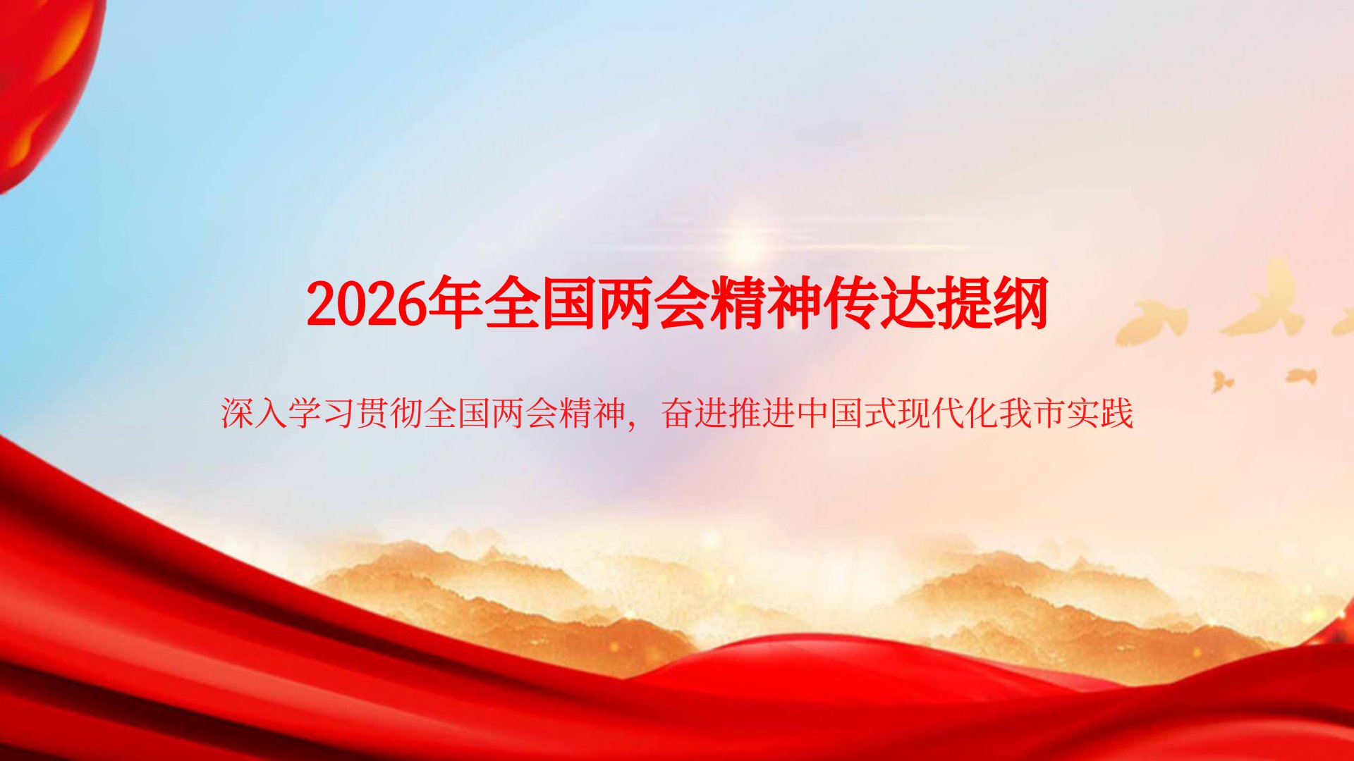 2026年全国两会精神传达提纲深入学习贯彻全国两会精神,奋进推进中国式现代化我市实践目录01会议基本情况和主要成果02政府工作报告的核心要义03“十五五”规划纲要的战略部署04会议审议通过的重要法律草案05人大常委会及“两院”报告精神06学习贯彻两会精神的工作安排一、会议的基本情况和主要成果会议基本情况会议时间2026年3月5日开幕,3月12日闭幕,历时8天。参会人员来自全国各地、各民族、各行业的全国人大代表和全国政协委员。会议意义在“十四五”收官、“十五五”开局的关键时期召开,具有里程碑意义。凝心聚力·共商国是·开创未来会议主要成果(一)会议审议通过了一系列重大事项:政府工作报告国民经济和社会发展第十五个五年规划纲要2026年国民经济和社会发展计划2026年中央和地方预算会议主要成果(二)...