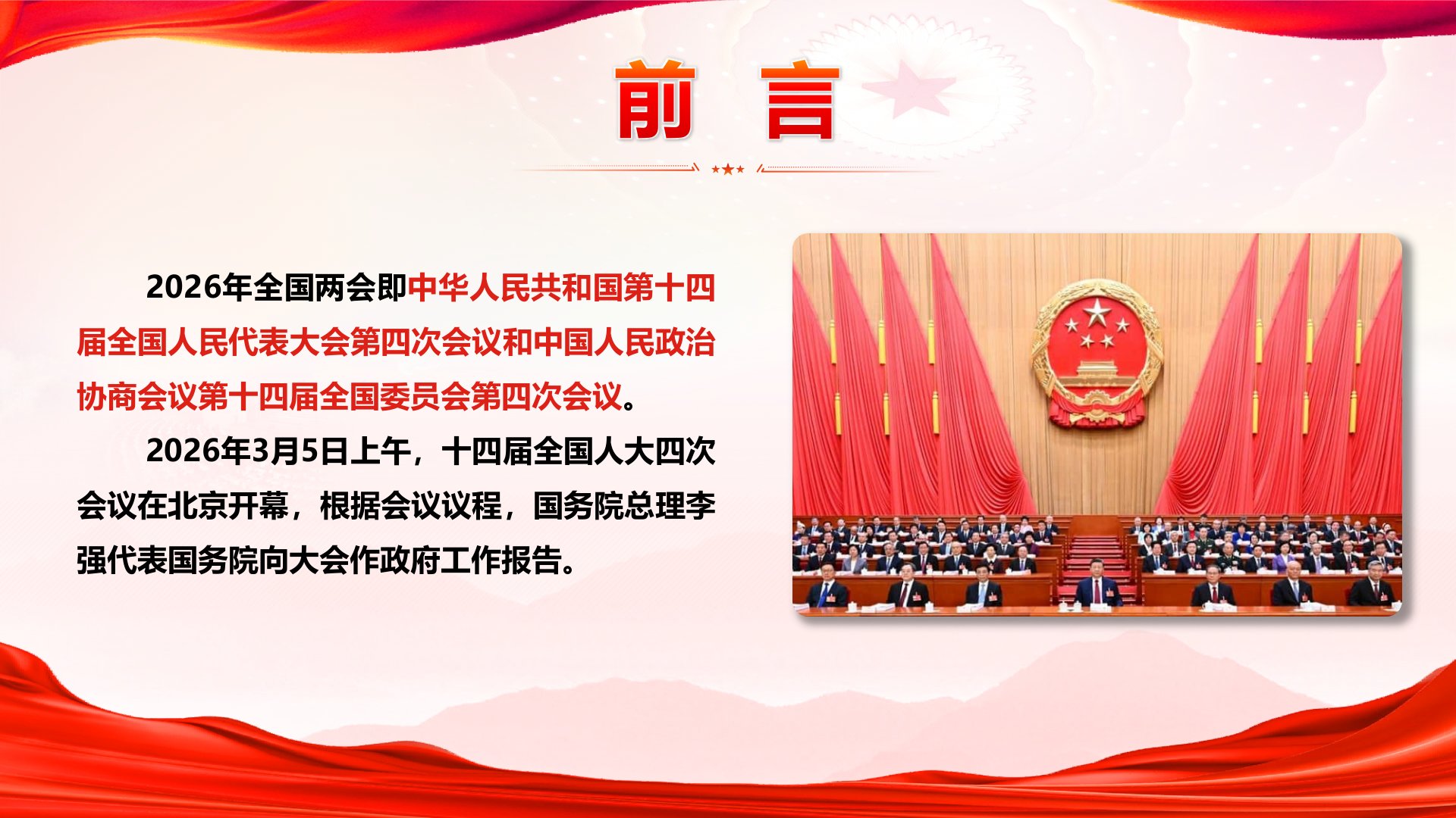 2026年全国两会政府工作报告重点内容学习前言2026年全国两会即中华人民共和国第十四届全国人民代表大会第四次会议和中国人民政治协商会议第十四届全国委员会第四次会议。2026年3月5日上午,十四届全国人大四次会议在北京开幕,根据会议议程,国务院总理李强代表国务院向大会作政府工作报告。目录2025年工作回顾一、2025年工作回顾“十四五”圆满收官,中国式现代化迈出新的坚实步伐2025年是很不平凡的一年。党的二十届四中全会胜利召开,擘画了未来五年我国发展的宏伟蓝图。我们隆重纪念中国人民抗日战争暨世界反法西斯战争胜利80周年,设立台湾光复纪念日,极大振奋民族精神、激发爱国热情、凝聚奋斗力量。一、2025年工作回顾“十四五”圆满收官,中国式现代化迈出新的坚实步伐面对国内外形势深刻复杂的变化,以习近平...