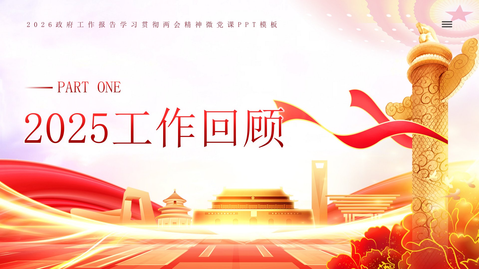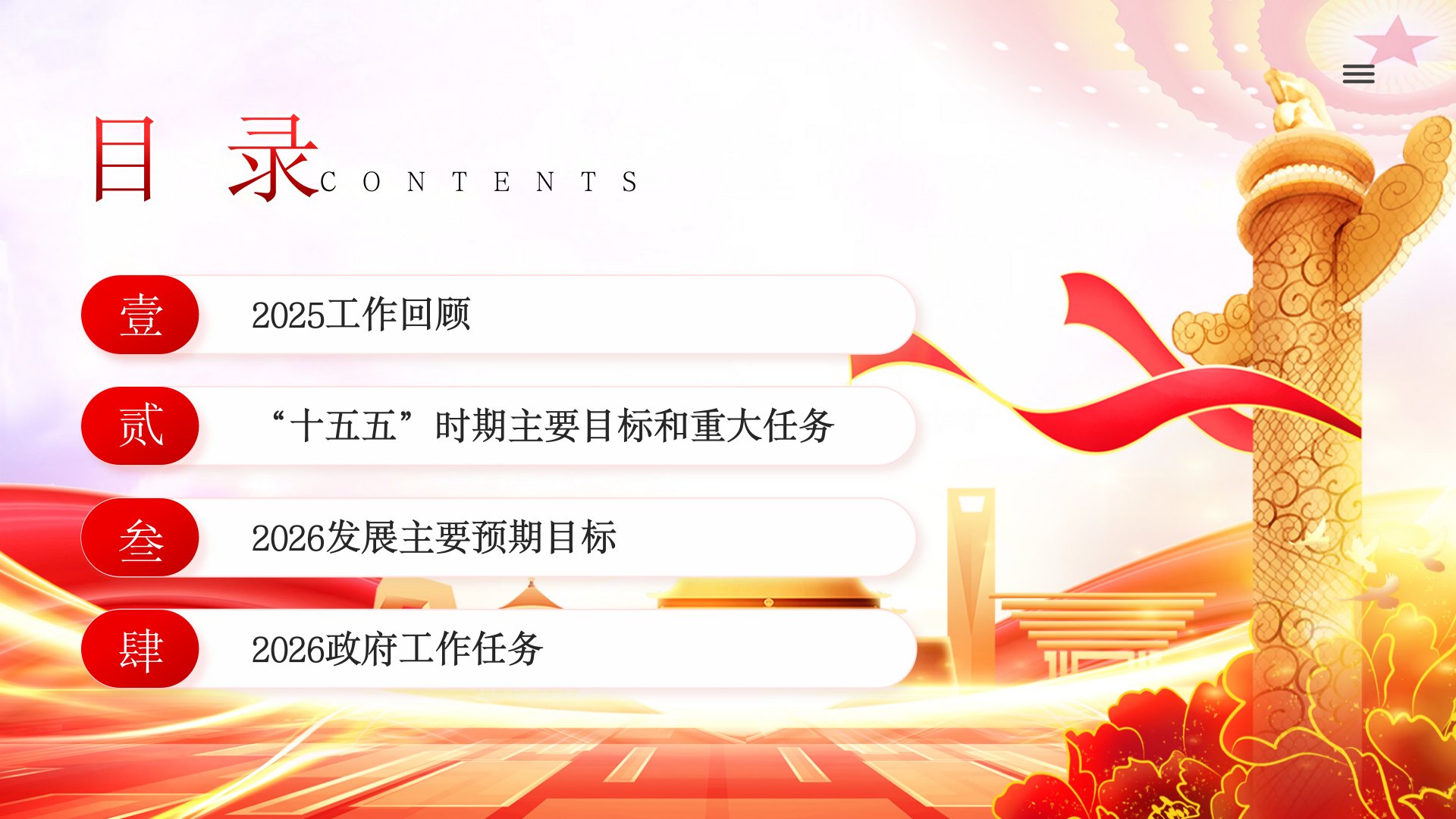 政府工作报告目录Contents2025工作回顾★2025工作回顾★2025工作回顾★2025工作回顾★2025工作回顾全社会研发经费投入强度达到2.8%技术合同成交额增长10.8%数字经济核心产业增加值占国内生产总值比重提高到10.5%以上实施全国统一大市场建设指引,出台新版市场准入负面清单进出口量稳质升,出口增长6.1%★2025工作回顾常住人口城镇化率达到67.9%脱贫人口务工就业规模稳定在3000万人以上长期护理保险制度覆盖3亿人城乡居民基础养老金月最低标准提高20元国内出游人次增长16.2%入境旅游人次增长17.1%★2025工作回顾地级及以上城市细颗粒物(PM2.5)平均浓度下降4.4%地表水水质优良断面比例提高到91.4%新型储能装机规模超过1.3亿千瓦非化石能源消费占比达到2...