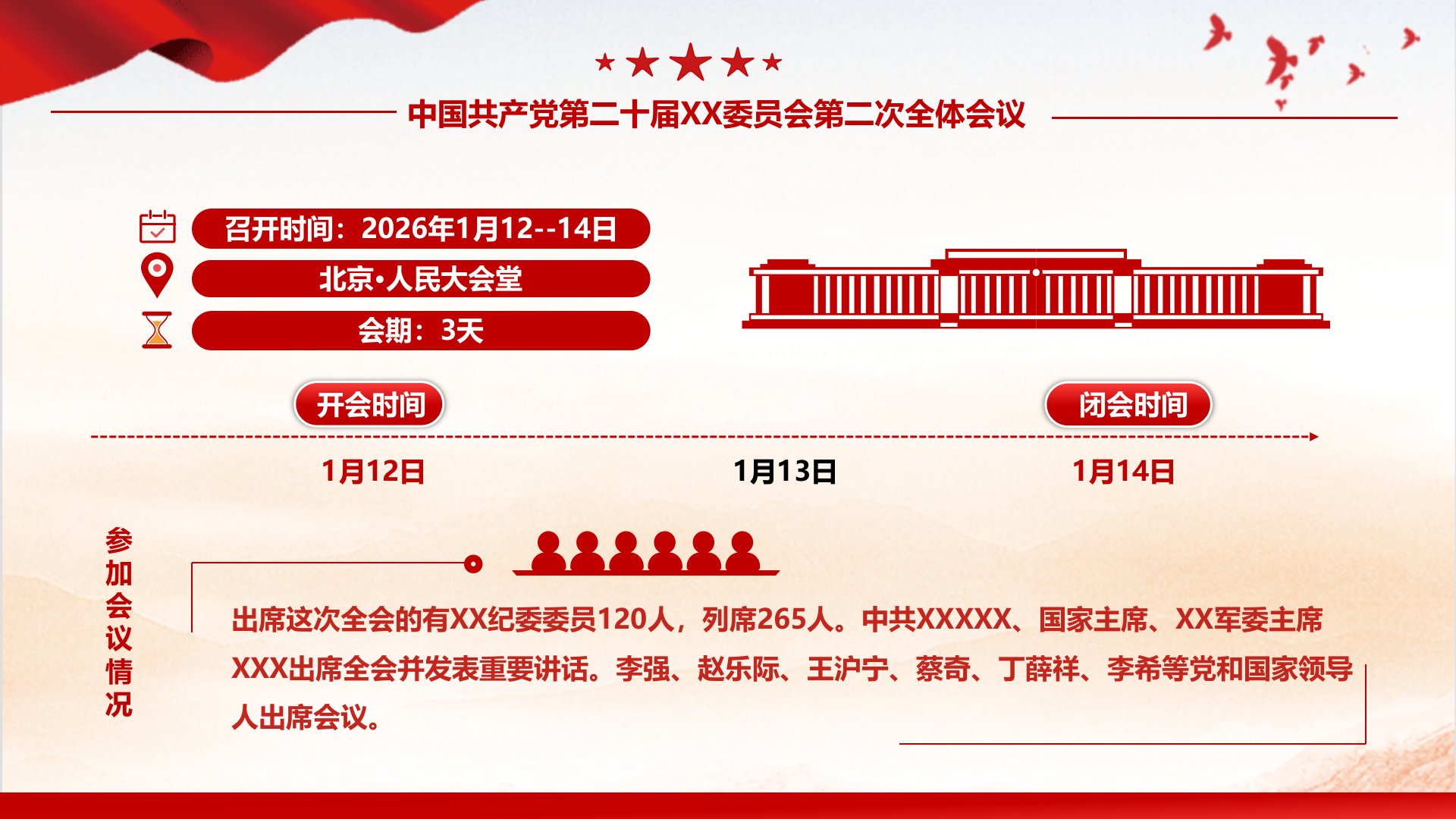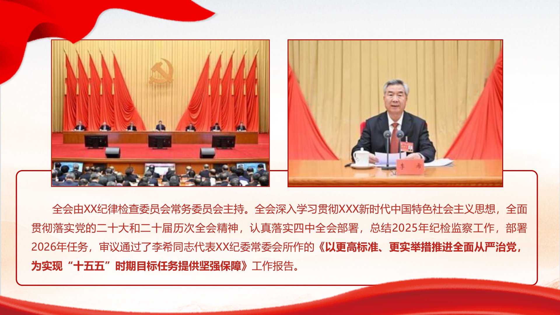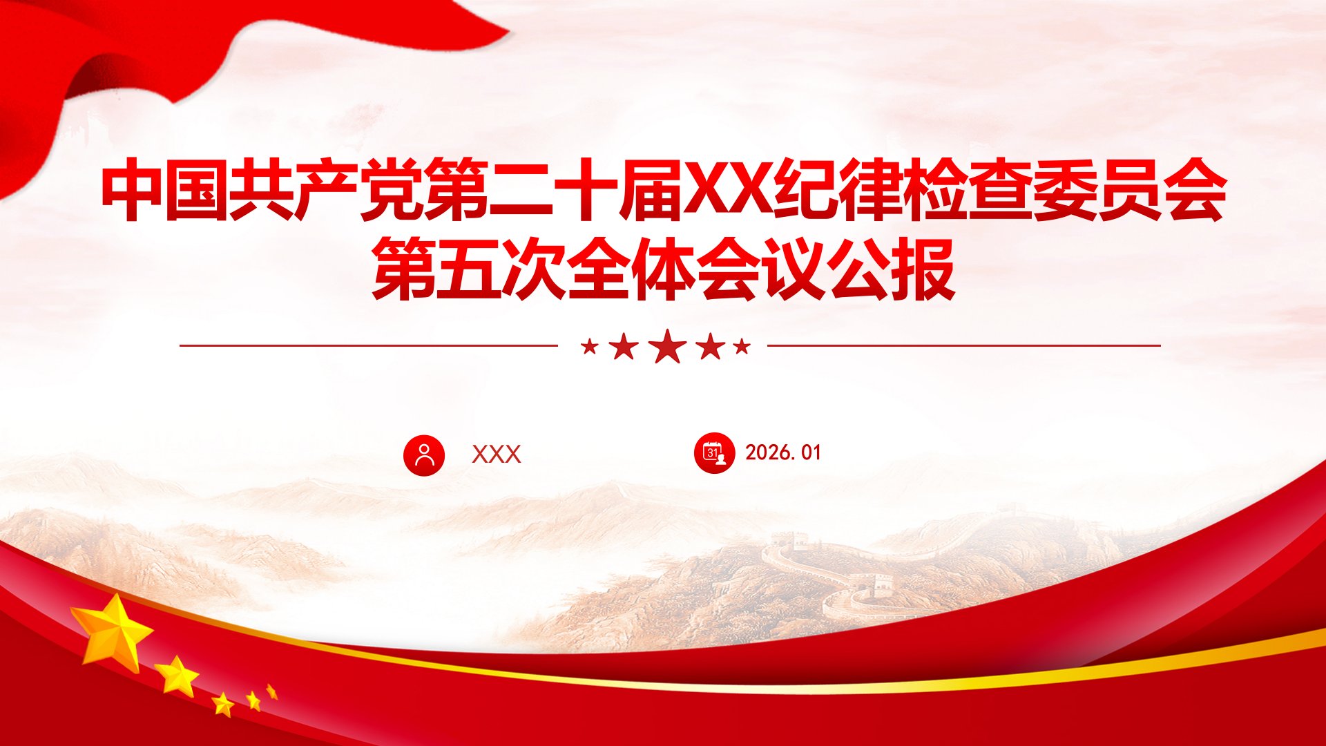 中国共产党第二十届XX纪律检查委员会第五次全体会议公报XXX召开时间:2026年1月12--14日北京·人民大会堂会期:3天参加会议情况出席这次全会的有XX纪委委员120人,列席265人。中共XXXXX、国家主席、XX军委主席XXX出席全会并发表重要讲话。李强、赵乐际、王沪宁、蔡奇、丁薛祥、李希等党和国家领导人出席会议。全会由XX纪律检查委员会常务委员会主持。全会深入学习贯彻XXX新时代中国特色社会主义思想,全面贯彻落实党的二十大和二十届历次全会精神,认真落实四中全会部署,总结2025年纪检监察工作,部署2026年任务,审议通过了李希同志代表XX纪委常委会所作的《以更高标准、更实举措推进全面从严治党,为实现“十五五”时期目标任务提供坚强保障》工作报告。全会认真学习、深刻领会XXXXXX重要讲...