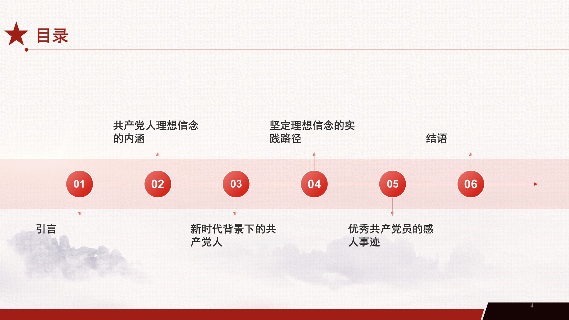 坚定理想信念,在新征程上续写高质量发展新篇章报告人:A书记2026.044目录一、引言概述本次党课的背景、目的和主要内容34课程背景4课程目的4课程结构二、共产党人理想信念的内涵深入探讨共产党人理想信念的理论基础和核心要素34理想信念的定义4理想信念的重要性4理想信念的特征4理想信念的历史渊源三、新时代背景下的共产党人探讨新时代背景下共产党人如何坚定理想信念,应对新挑战34新时代的定义4新时代的挑战4新时代的机遇4新时代的要求四、坚定理想信念的实践路径提供具体的实践方法和路径,帮助共产党人坚定理想信念34学习理论知识4加强党性修养4投身社会实践4弘扬优秀文化五、优秀共产党员的感人事迹通过具体案例,展示优秀共产党员的崇高精神和感人事迹34焦裕禄的精神4钟南山的担当4黄文秀的奉献4张桂梅的坚守六...