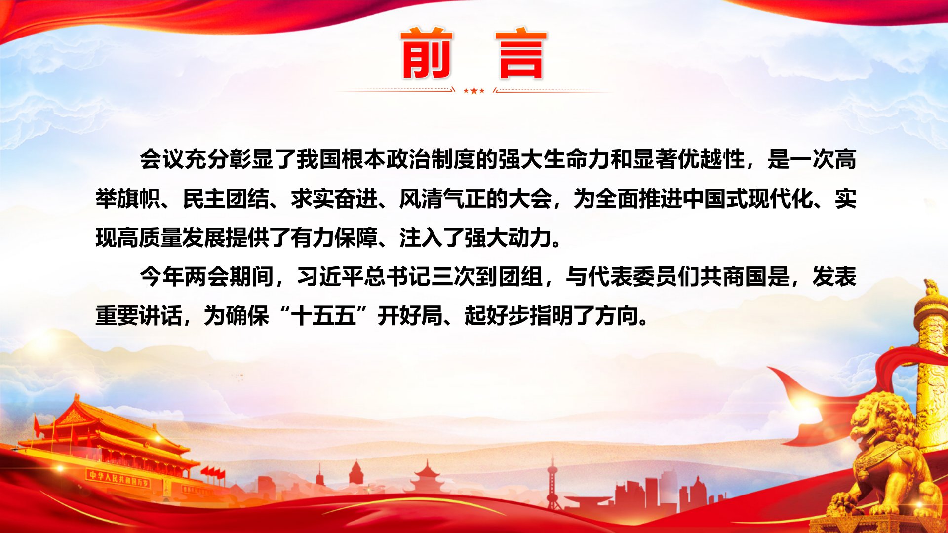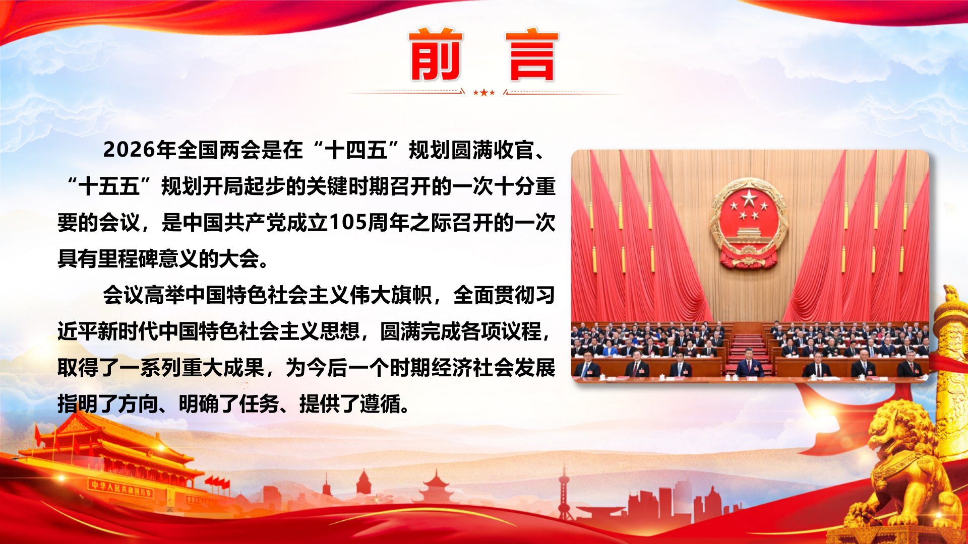 2026年全国两会期间习近平总书记下团组讲话精神前言2026年全国两会是在“十四五”规划圆满收官、“十五五”规划开局起步的关键时期召开的一次十分重要的会议,是中国共产党成立105周年之际召开的一次具有里程碑意义的大会。会议高举中国特色社会主义伟大旗帜,全面贯彻习近平新时代中国特色社会主义思想,圆满完成各项议程,取得了一系列重大成果,为今后一个时期经济社会发展指明了方向、明确了任务、提供了遵循。前言会议充分彰显了我国根本政治制度的强大生命力和显著优越性,是一次高举旗帜、民主团结、求实奋进、风清气正的大会,为全面推进中国式现代化、实现高质量发展提供了有力保障、注入了强大动力。今年两会期间,习近平总书记三次到团组,与代表委员们共商国是,发表重要讲话,为确保“十五五”开好局、起好步指明了方向。“发展...