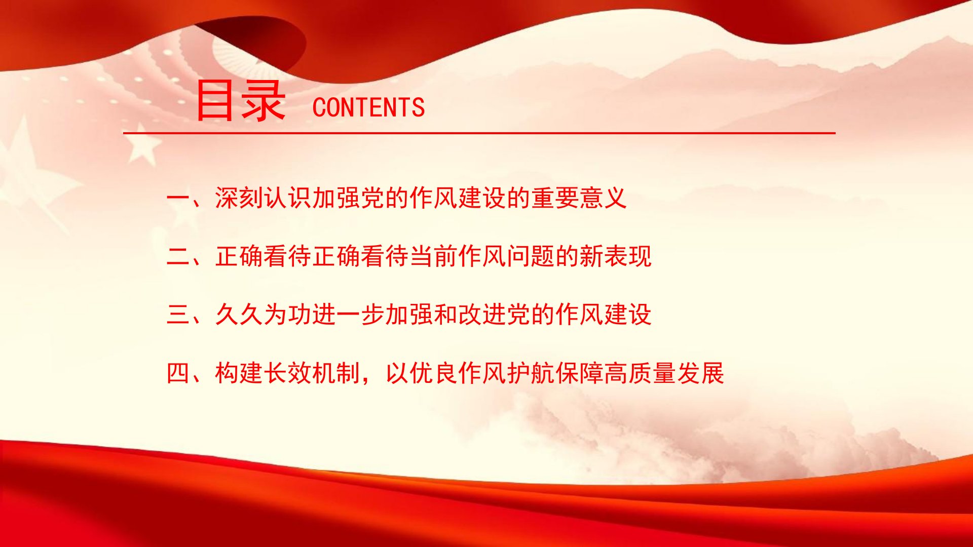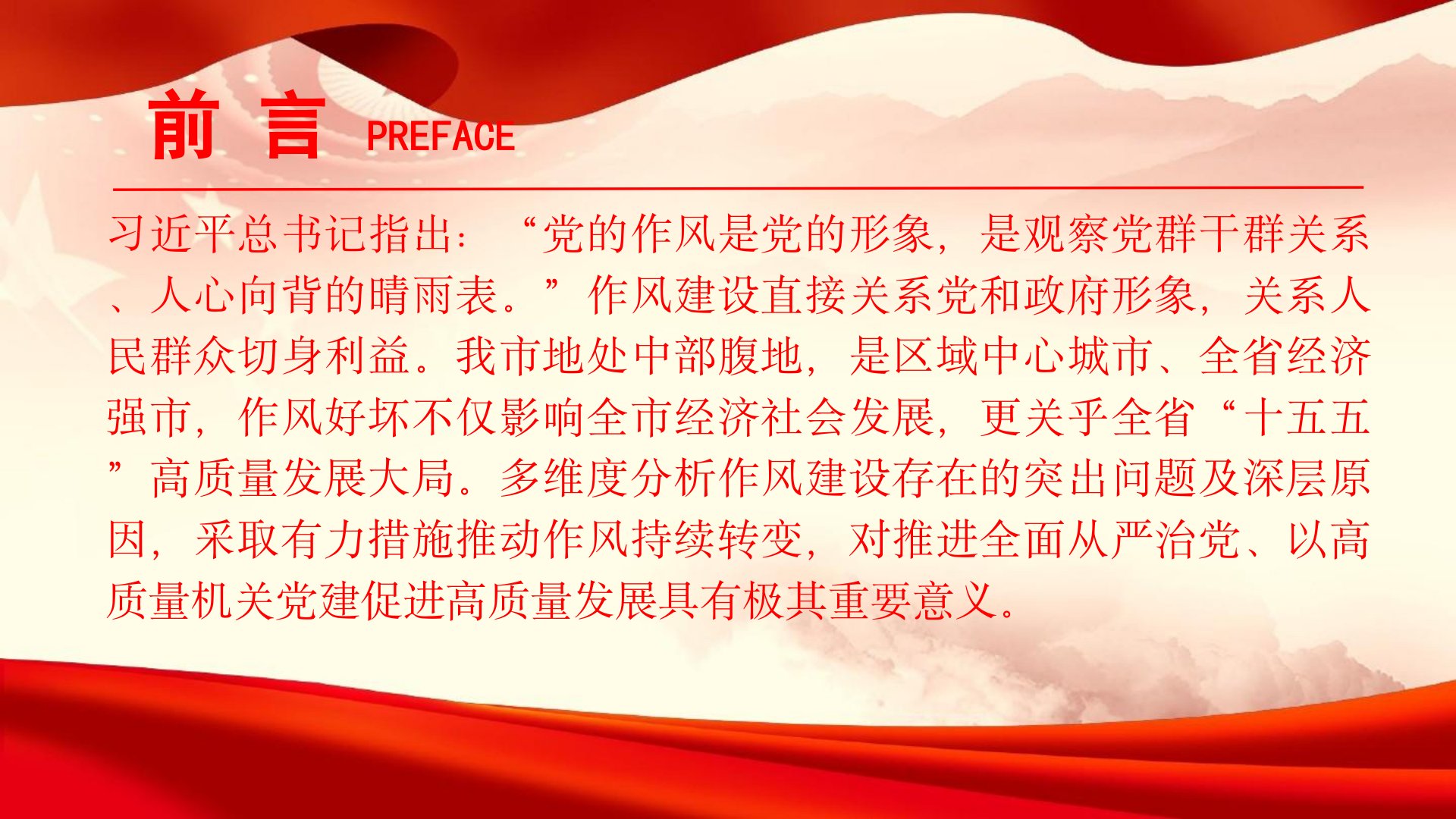 加强和改进党的作风建设,以优良党风政风护航保障高质量发展主讲人:A书记前言PREFACE习近平总书记指出:“党的作风是党的形象,是观察党群干群关系、人心向背的晴雨表。”作风建设直接关系党和政府形象,关系人民群众切身利益。我市地处中部腹地,是区域中心城市、全省经济强市,作风好坏不仅影响全市经济社会发展,更关乎全省“十五五”高质量发展大局。多维度分析作风建设存在的突出问题及深层原因,采取有力措施推动作风持续转变,对推进全面从严治党、以高质量机关党建促进高质量发展具有极其重要意义。目录CONTENTS一、深刻认识加强党的作风建设的重要意义二、正确看待正确看待当前作风问题的新表现三、久久为功进一步加强和改进党的作风建设四、构建长效机制,以优良作风护航保障高质量发展3一、深刻认识加强党的作风建设的重要...