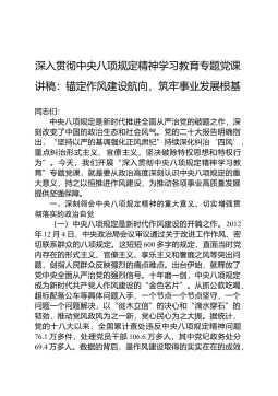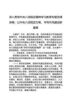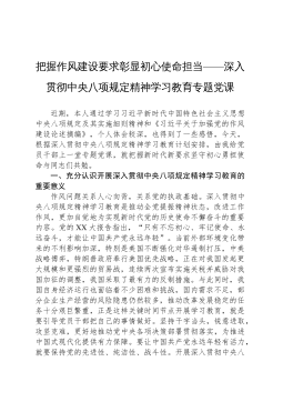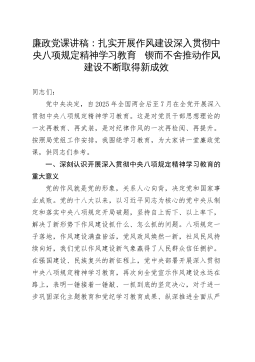 廉政党课讲稿:扎实开展作风建设深入贯彻中央八项规定精神学习教育锲而不舍推动作风建设不断取得新成效同志们:党中央决定,自2025年全国两会后至7月在全党开展深入贯彻中央八项规定精神学习教育。这是对党员干部思想理论的一次再教育、再武装,是对纪律作风的一次再检阅、再提升。按照局党组工作安排,我围绕学习教育,为大家讲一堂廉政党课,供同志们参考。一、深刻认识开展深入贯彻中央八项规定精神学习教育的重大意义党的作风就是党的形象,关系人心向背,决定党和国家事业成败。党的十八大以来,以习近平同志为核心的党中央从制定和落实中央八项规定开局破题,坚持自上而下、以上率下,解决了新形势下作风建设抓什么、怎么抓的问题。八...