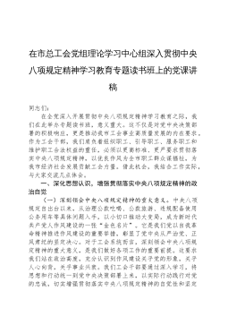 在市总工会党组理论学习中心组深入贯彻中央八项规定精神学习教育专题读书班上的党课讲稿同志们:在全党深入开展贯彻中央八项规定精神学习教育之际,我们在此举办专题读书班,意义重大。这不仅是对党中央决策部署的积极响应,更是推动我市工会事业高质量发展的内在要求。作为工会干部,我们肩负着组织职工、引导职工、服务职工和维护职工合法权益的重任,必须以更高标准、更严要求贯彻落实中央八项规定精神,以优良作风为全市职工群众谋福祉,为我市经济社会发展贡献工会力量。借此机会,我结合工作实际,与大家交流几点体会。一、深化思想认识,增强贯彻落实中央八项规定精神的政治自觉(一)深刻领会中央八项规定精神的重大意义。中央八项规定自...