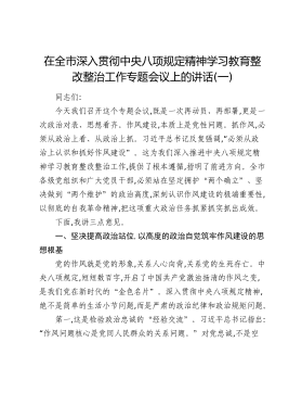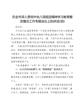 在全市深入贯彻中央八项规定精神学习教育整改整治工作专题会议上的讲话(四)同志们:今天这个会,就是要亮明一个态度:在贯彻执行中央八项规定精神上,市委的决心坚定不移,标准绝不降低,执纪绝不手软。作风建设,犹如逆水行舟,一篙松劲,退不止一篙。习近平总书记告诫全党,“必须常抓不懈、紧抓不放,决不能有松劲歇脚、疲劳厌战的情绪”。当前,我市作风建设总体是好的,但绝不能盲目乐观。一些深层次、顽固性的问题还没有彻底根除,一些隐形变异的新花样还在不断冒头。我们必须发扬彻底的斗争精神,以刀刃向内的勇气、动真碰硬的锐气,向一切歪风邪气宣战,把严的基调、严的措施、严的氛围长期坚持下去。下面,我着重从“斗争”和“责任”两个方面,讲四点要求。一、以刀刃向内的勇气,向“思想顽疾”坚决开刀思想是行动的“总开关”。作风上出问...