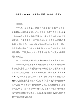 在银行2025年三季度客户经理工作例会上的讲话同志们:下午好。今天召集大家召开三季度客户经理工作例会,主要目的非常明确,就是分析当前形势,部署下阶段任务,确保三季度各项工作能够落地见效,为完成全年目标任务奠定坚实基础。三季度是承上启下的关键时期,也是业务发展的黄金期,能不能抓住这个窗口期,直接关系到全年的收成。刚才,信贷管理部通报了近期的业务数据,也进行了专题培训,讲得都很具体。下面,结合大家的汇报和当前的工作重点,我再强调三点意见。一、肯定成绩,正视差距,在精准研判中把握发展主动权今年以来,面对复杂多变的宏观经济环境和日趋激烈的市场竞争,全行上下,特别是奋斗在一线的客户经理队伍,付出了艰辛的努力,取得了来之不易的成绩。截至昨天,也就是8月6日,三季度已经过去一个多月,全行累计新增贷款客户5...