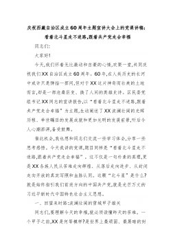 庆祝西藏自治区成立60周年主题宣讲大会上的党课讲稿:看着北斗星走不迷路,跟着共产党走会幸福同志们:大家好!今天,我们怀着无比激动和自豪的心情,欢聚一堂,共同庆祝我们XX自治区成立60周年。60年,在人类历史的长河中或许只是弹指一挥间,但对于XX这片神奇而壮美的土地而言,却是一部沧桑巨变、换了人间的英雄史诗。区民委党组书记XX同志的宣讲报告,以“看着北斗星走不迷路,跟着共产党走会幸福”为主题,生动阐述了XX波澜壮阔的光辉历程、举世瞩目的发展成就和更加光明的发展前景,听后令人心潮澎湃,备受鼓舞。借此机会,我也想和同志们交流一些学习体会,分享一些思考感悟。今天我讲的党课,题目同样是“看着北斗星走不迷路,跟着共产党走会幸福”。这不仅是一句朴素的真理,更是XX各族人民从苦难走向辉煌、从落后走向进步、从...