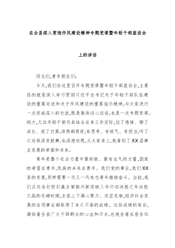 在全县深入贯彻作风建设精神专题党课暨年轻干部座谈会上的讲话同志们,青年朋友们:今天,我们在这里召开专题党课暨年轻干部座谈会,主要目的就是深入学习贯彻习近平总书记关于年轻干部队伍建设的重要论述和关于作风建设的重要指示精神,与大家进行一次坦诚深入的交流,既是集体谈心谈话,也是一次专题党课。刚才,几位年轻干部代表结合自身工作实际,谈了感悟、聊了成长、说了打算,讲得都很好,有思考、有锐气、有担当,听了之后我深受鼓舞,也深感欣慰,从大家身上,我看到了XX县事业发展的希望和未来。青年是整个社会力量中最积极、最有生气的力量,国家的希望在青年,民族的未来在青年。我们党的事业,我们XX县的发展,同样需要一代又一代有志青年接续奋斗。当前,我们正处在打好打赢全面振兴新突破三年行动决胜之年决胜之战的关键时期,全县上...