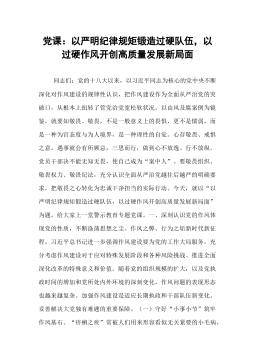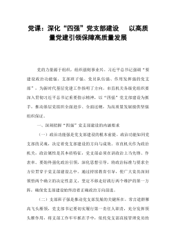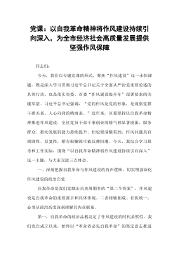 党课:以自我革命精神将作风建设持续引向深入,为全市经济社会高质量发展提供坚强作风保障同志们:今天,我们以专题党课的形式,聚焦“作风建设”这一永恒课题,既是深入学习贯彻习近平总书记关于全面从严治党重要论述的具体行动,也是落实省委、市委“作风建设提升年”部署要求的关键举措。习近平总书记强调:“党的作风是党的形象,是观察党群干群关系、人心向背的晴雨表。”近年来,区委坚持以自我革命精神推进作风建设,全区党员干部干事创业的精气神显著提振,服务群众、推动发展的能力持续提升。但也要清醒看到,作风问题具有顽固性、反复性,稍有松懈就可能反弹回潮。今天,我结合学习思考和工作实际,围绕“以自我革命精神将作风建设持续引向深入”这一主题,与大家交流三点体会。一、深刻把握自我革命与作风建设的内在逻辑,切实增强深化作风建...