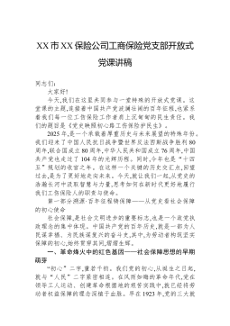 XX市XX保险公司工商保险党支部开放式党课讲稿同志们:大家好!今天,我们在这里共同参与一堂特殊的开放式党课。这堂课的主题,连接着中国共产党波澜壮阔的百年征程,也紧系着我们每一位工伤保险工作者肩上沉甸甸的民生责任。我们的题目是《党史映照初心路工伤保险护民生》。2025年,是一个承载着厚重历史与未来展望的特殊年份。我们迎来了中国人民抗日战争暨世界反法西斯战争胜利80周年,联合国成立80周年,中华人民共和国成立76周年,中国共产党也走过了104年的光辉历程。同时,今年也是“十四五”规划的收官之年。在这样一个关键的历史交汇点,回望过去,是为了更好地走向未来。今天,就让我们一起,从党史的浩瀚长河中汲取智慧与力量,思考如何在新时代更好地履行我们工伤保险人的职责与使命。第一部分溯源·百年征程铸保障——从党...