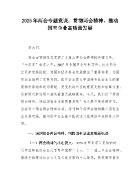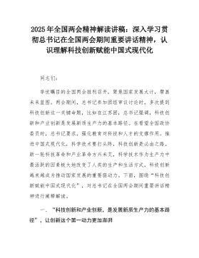2025年全国两会精神解读讲稿:深入学习贯彻总书记在全国两会期间重要讲话精神,认识理解科技创新赋能中国式现代化同志们:举世瞩目的全国两会胜利召开,聚焦国家发展大计,擘画未来蓝图。两会期间,总书记参加团组审议讨论时,多次提到科技创新这一关键命题,比如在江苏团,总书记强调,科技创新和产业创新是发展新质生产力的基本路径。在看望全国政协委员时,总书记要求,强化教育对科技和人才的支撑作用。推进中国式现代化,科学技术要打头阵,科技创新是必由之路。新一轮科技革命和产业革命方兴未艾,科学技术作为生产力中最活跃的因素极大地改变了人类的生产和生活方式,科技创新越来越成为推动国家发展的重要驱动力。下面,围绕“科技创...