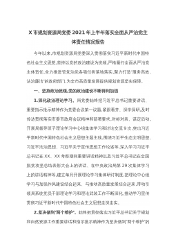 X市规划资源局党委2021年上半年落实全面从严治党主体责任情况报告今年以来,市规划资源局党委深入贯彻落实习近平新时代中国特色社会主义思想,坚持以党的政治建设为统领,严格履行全面从严治党主体责任,全力推进管党治党各项任务落地落实,聚力打造“服务高效、法治廉洁”的政府部门,为全市高质量发展提供规划资源坚实保障。一、坚持政治统领,党的政治建设不断得到加强1.深化政治理论学习。局党委始终把习近平总书记重要讲话、重要指示批示精神作为党委会议第一议题,紧跟看齐、深学深研,及时传达贯彻落实市委市政府会议精神和部署要求,对标对表、谋定后动。开展局领导班子理论学习中心组集体学习和讨论交流9次,突出习近平新时代中...