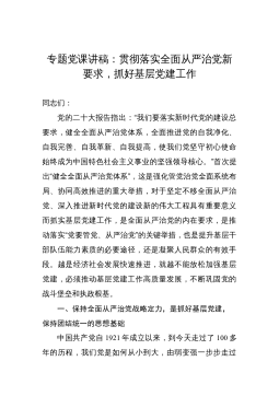 廉政党课:准确把握新时代新征程全面从严治党新要求,自觉锤炼党性意识、筑牢思想防线全面建设社会主义现代化国家、全面推进中华民族伟大复兴,关键在党。今年是全面贯彻党的XX大精神的开局之年,推进全面从严治党意义特殊、责任重大。党的XX大报告对坚定不移全面从严治党、深入推进新时代党的建设新的伟大工程作出重大部署;党章修正案调整充实党的建设总体要求,充实完善坚持党的全面领导有关内容;二十届中央纪委二次全会发出铿锵号令,释放出坚定不移推动正风肃纪反腐向纵深发展的清晰信号。我们要深悟透习近平总书记关于全面从严治党的重要论述,深刻把握党的XX大作出的战略部署,深刻领悟“两个确立”的决定性意义,增强“四个意识”...