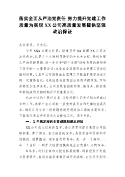 落实全面从严治党责任努力提升党建工作质量为实现XX公司高质量发展提供坚强政治保证各位委员、同志们:今天XXX齐聚在这里,隆重召开XX集团XX公司首次党代会。这是在中央胜利召开党的十九大会议,开创全面从严治党新局面,进一步完善“四个全面”战略布局的新形势下召开的一次重要会议;也是在全国国有企业党建工作会议胜利闭幕,习总书记对国有企业党建工作提出新要求后召开的一次重要会议;还是因各地密集出台各类调控政策,市场形势更加复杂多变,公司发展面临新形势、新任务、新机遇和新挑战的关键时期召开的重要会议。这次会议的主要任务是,总结回顾公司党组织自组建以来的工作,选举产生公司新一届党的委员会和纪律检查委员会,确...