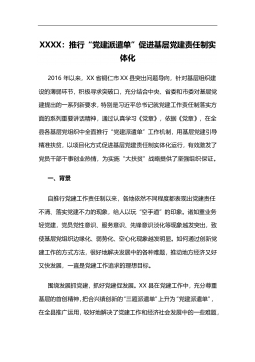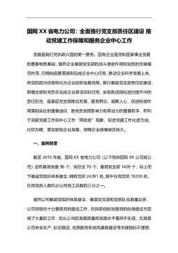 国网XX省电力公司:全面推行党支部责任区建设推动党建工作保障和服务企业中心工作发展是我们党执政兴国的第一要务。国有企业是党和国家事业发展的重要物质基础,国有企业基层党支部的战斗堡垒作用和党员的先锋模范作用,归根结底要落脚到完成企业中心任务、推动企业科学发展上来,将党的政治优势转化为企业创新发展优势。推行基层党支部责任区建设,明确支部和党员在完成企业各项目标任务、实现各项指标进位提升中的责任担当,是基层党支部推动发展、服务群众、凝聚人心、促进和谐作用落到实处的重要途径,是党员发挥影响力和带动力的重要抓手,有利于克服党建工作和中心工作“两张皮”现象,促进党建工作化虚为实、化软为硬,更加紧贴企业发展...