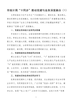 ·1市统计局“十同步”推动党建与业务深度融合(1)为贯彻落实习近平总书记“只有围绕中心、建设队伍、服务群众,推动党建和业务深度融合,机关党建才能找准定位”的重要指示要求,市统计局坚持“业务工作推进到哪里,党建工作就覆盖到哪里”,积极推动“党建+业务”深度融合。一、党建业务和统计业务同步部署年初统计工作会议,全面安排部署年度党建工作要点和统计工作任务;季度业务分析会,同时通报党建工作和业务工作情况,学习重要文件、研究重大问题、部署重大任务;党的建设工作会议,听取工作开展情况汇报,分析研判机关党建和统计业务同步推进过程中出现的新情况、新问题,研究制定解决问题的新方法、新举措。二、党建制度和业务制度...
