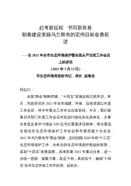 赶考新征程书写新答卷朝着建设美丽乌兰察布的宏伟目标奋勇前进——在2021年全市生态环境保护暨全面从严治党工作会议上的讲话(2021年3月13日)市生态环境局党组书记、局长赵海龙同志们:全国“两会”刚刚闭幕,“十四五”发展征程已然开启。昨天,市政府召开2021年全市城建、环保、自然资源口年度工作会议,对今年重点工作作出总体安排。今天,我们接着召开部门年度工作会议对其进行细化实化具体化,主要任务是反复学习领会XJP总书记重要讲话精神,再次重温全国全区生态环境保护工作会议和市委四届十次全会、2021年乌兰察布市“两会”精神,总结回顾2020年和“十三五”生态环境保护工作,分析当前生态环境...