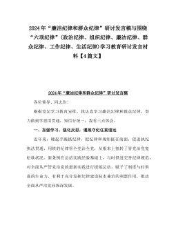 2024年“廉洁纪律和群众纪律”研讨发言稿与围绕“六项纪律”(政治纪律、组织纪律、廉洁纪律、群众纪律、工作纪律、生活纪律)学习教育研讨发言材料【4篇文】