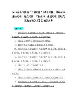 2024年全面围绕“六项纪律”(政治纪律、组织纪律、廉洁纪律、群众纪律、工作纪律、生活纪律)研讨交流发言稿[9篇】汇编供参考