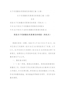 关于巡视整改进展情况的通报汇编(3篇)关于巡视整改进展情况的通报汇编(3篇)目录党组关于巡察整改进展情况的通报(局机关)1中共XX市委关于巡视整改进展情况的通报8中共XX市委关于省委巡视整改进展情况通报16党组关于巡察整改进展情况的通报(局机关)根据区委统一部署,XXXX年X月XX日至X月XX日,XX市区委交叉巡察第二组对XX区XX局党组进行了巡察,X月X日,XX市区委交叉巡察第二组向XX区XX局党组反馈了巡察意见。按照党务公开原则和巡察工作有关要求,现将巡察整改情况予以公布。一、整改基本情况(一)统一思想,提高站位抓整改。局党组高度重视巡察整改工作,迅速学习传达巡察反馈会的会议精神以及相关文...