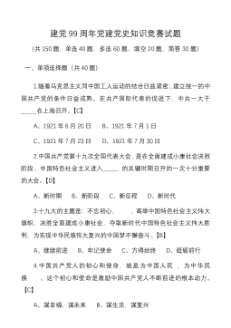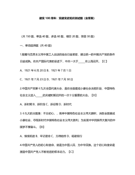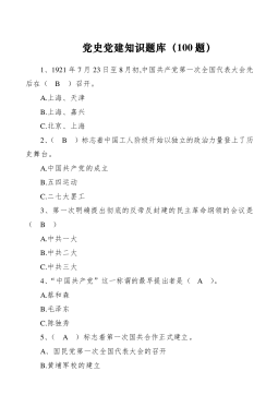 党史党建知识题库(100题)1、1921年7月23日至8月初,中国共产党第一次全国代表大会先后在(B)召开。A.上海、天津B.上海、嘉兴C.北京、上海2、(B)标志着中国工人阶级开始以独立的政治力量登上了历史舞台。A.中国共产党的成立B.五四运动C.二七大罢工3、第一次明确提出彻底的反帝反封建的民主革命纲领的会议是(B)A.中共一大B.中共二大C.中共三大4、“中国共产党”这一称谓的最早提出者是(A)。A.蔡和森B.毛泽东C.陈独秀5、(A)标志着第一次国共合作正式建立。A、国民党第一次全国代表大会的召开B.黄埔军校的建立C.北伐战争的开始6、中共三大确立的国共合作方式是(B)。A.党外合作B...