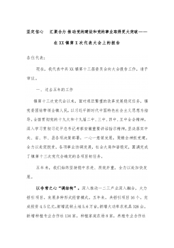 坚定信心汇聚合力推动党的建设和党的事业取得更大突破——在XX镇第X次代表大会上的报告各位代表:现在,我代表中共XX镇第十三届委员会向大会报告工作,请予审议。一、过去五年的工作镇第十三次党代会以来,面对艰巨繁重的改革发展稳定任务,镇党委团结带领全镇人民,以习近平新时代中国特色社会主义思想为指导,全面贯彻党的十九大和十九届二中、三中、四中、五中全会精神,深入学习贯彻习近平总书记考察安徽重要讲话指示精神,坚决落实中央、省、市、县各项决策部署,一心一意谋发展,聚精会神抓党建,全力以赴促脱贫,各项事业协调发展,社会大局和谐稳定,圆满完成了镇第十三次党代会确定的各项目标任务。五年来,我们始终坚持稳中求进、...