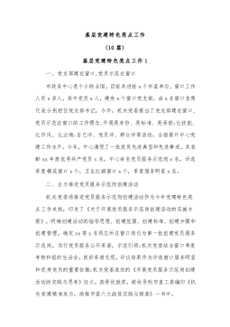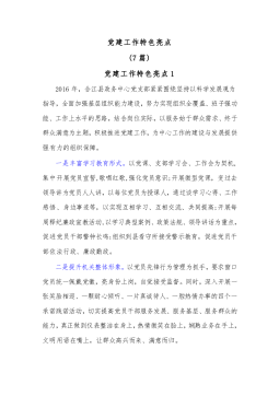 党建工作特色亮点(7篇)党建工作特色亮点12016年,合江县政务中心党支部紧紧围绕坚持以科学发展观为指导,全面加强基层组织能力建设,努力实现组织全覆盖、班子强功能、工作上水平的思路,结合岗位实际,以服务始于群众需求、终于群众满意为主题,积极推进党建工作,为中心工作的建设与发展提供强有力的组织保障。一是丰富学习教育形式。以党课、支部学习会、工作会为契机,集中开展党员宣誓,歌唱红歌,强化党员意识;开展微型党课,变过去领导讲为党员人人讲,以每位党员为授课人,通过谈学习心得、工作感悟、身边事迹等,以实现互相学习、互相交流、共同提高;开展每周释纪廉政宣教活动,以学习典型案例、政策法规、领导讲话为重点,促...
