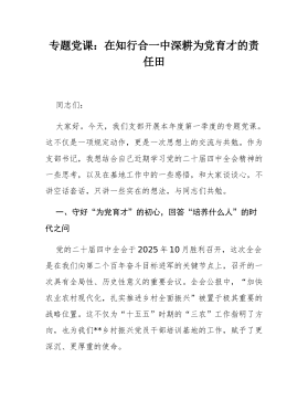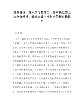 党课讲话:深入学习贯彻二十届中央纪委五次全会精神,锻造忠诚干净担当的新时代铁军同志们:今天,我们在此召开全体党员大会,共同学习领会中国共产党第二十届中央纪律检查委员会第五次全体会议精神。这次全会,是在我们党迈上全面建设社会主义现代化国家新征程、向第二个百年奋斗目标进军的关键节点,在“十五五”规划谋篇布局的重要时刻,召开的一次具有里程碑意义的会议。总书记发表的重要讲话,高屋建瓴、思想深邃、内涵丰富,深刻总结了新时代全面从严治党的新进展、新成效,精辟阐述了党的自我革命的重要思想,科学回答了我们党为什么要自我革命、为什么能自我革命、怎样推进自我革命等重大问题,为新征程上深入推进全面从严治党、党风廉政建设和反腐败斗争提供了根本遵循。我们法院全体党员干警,必须将学习好、宣传好、贯彻好此次全会精神,作为...